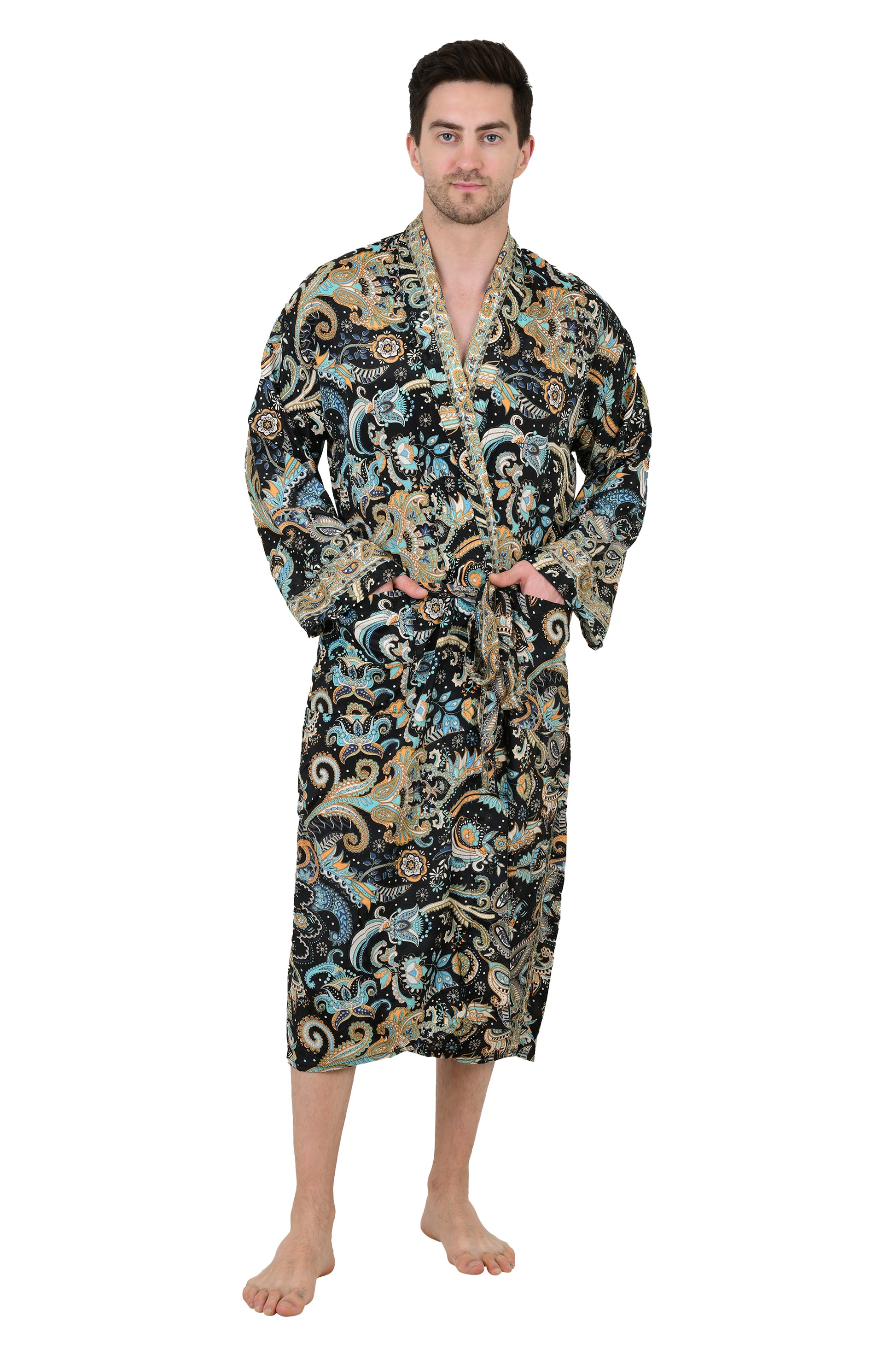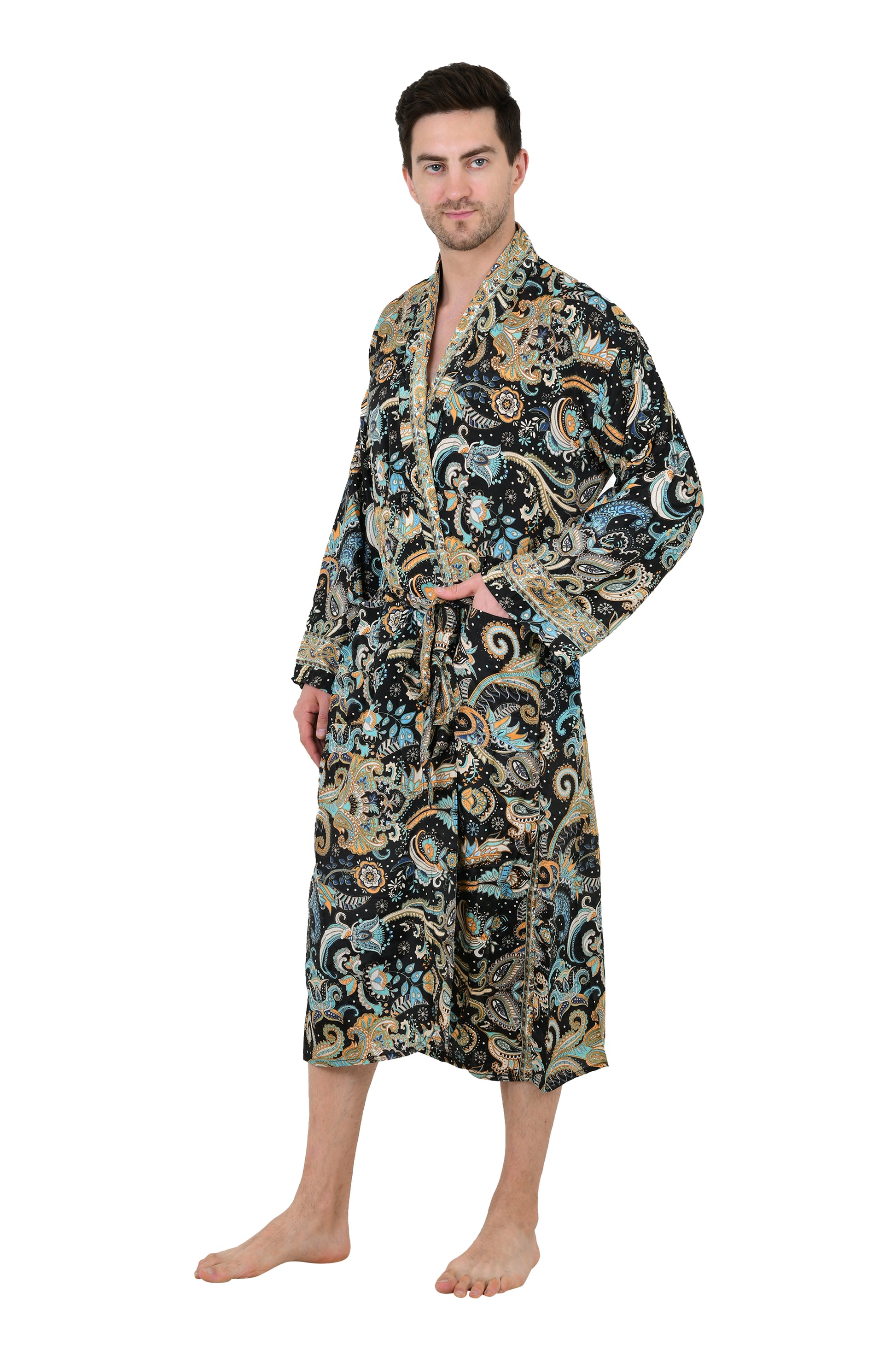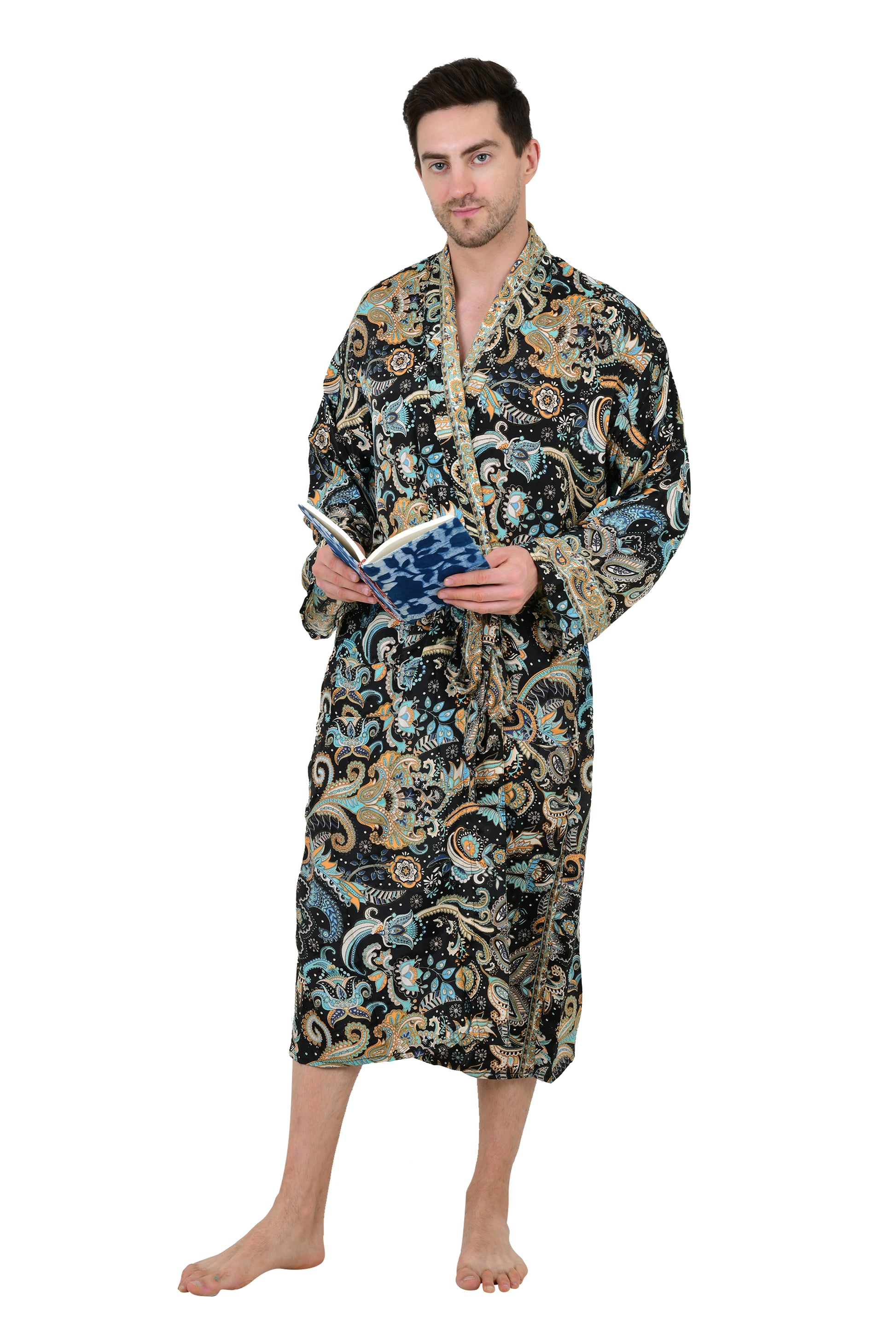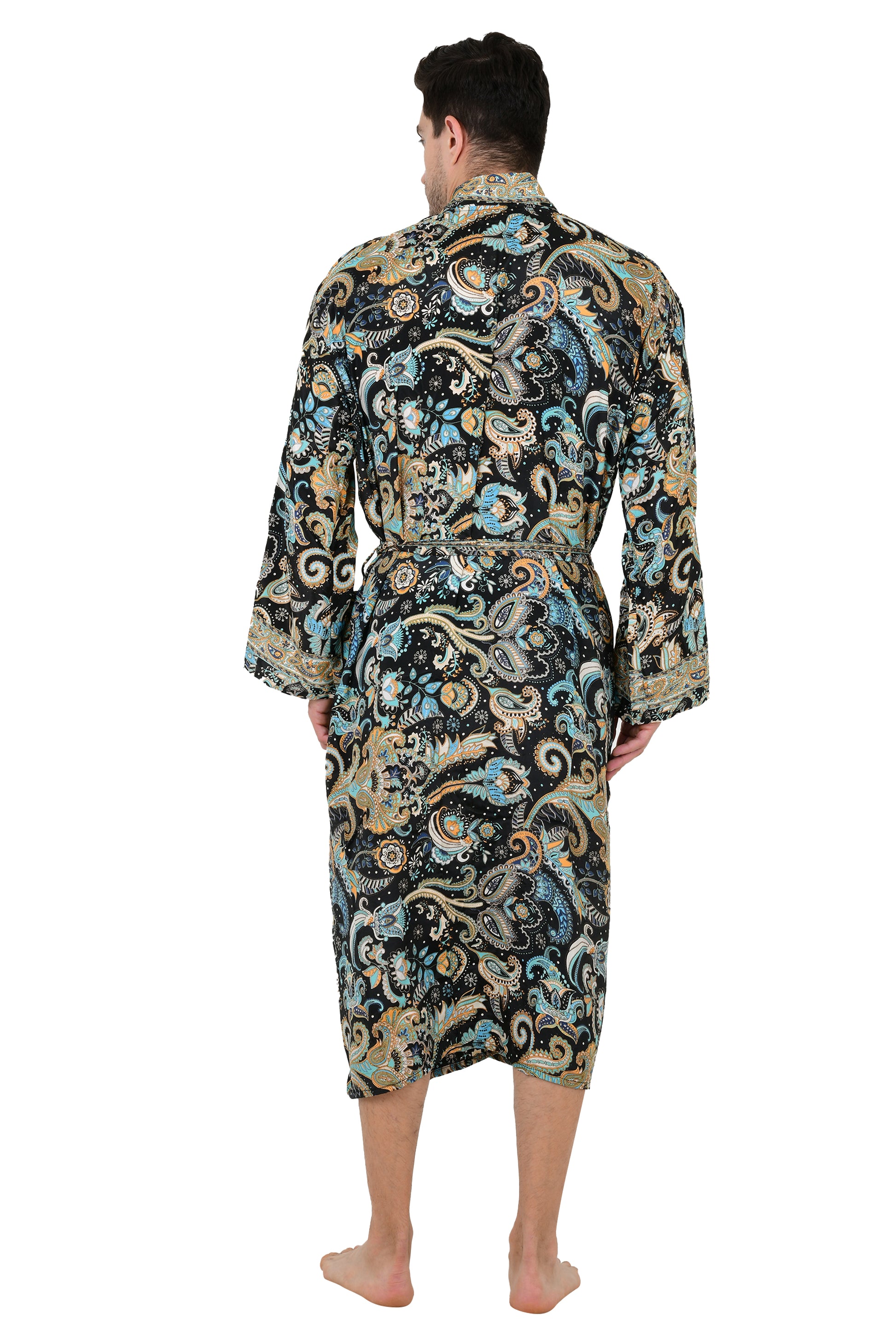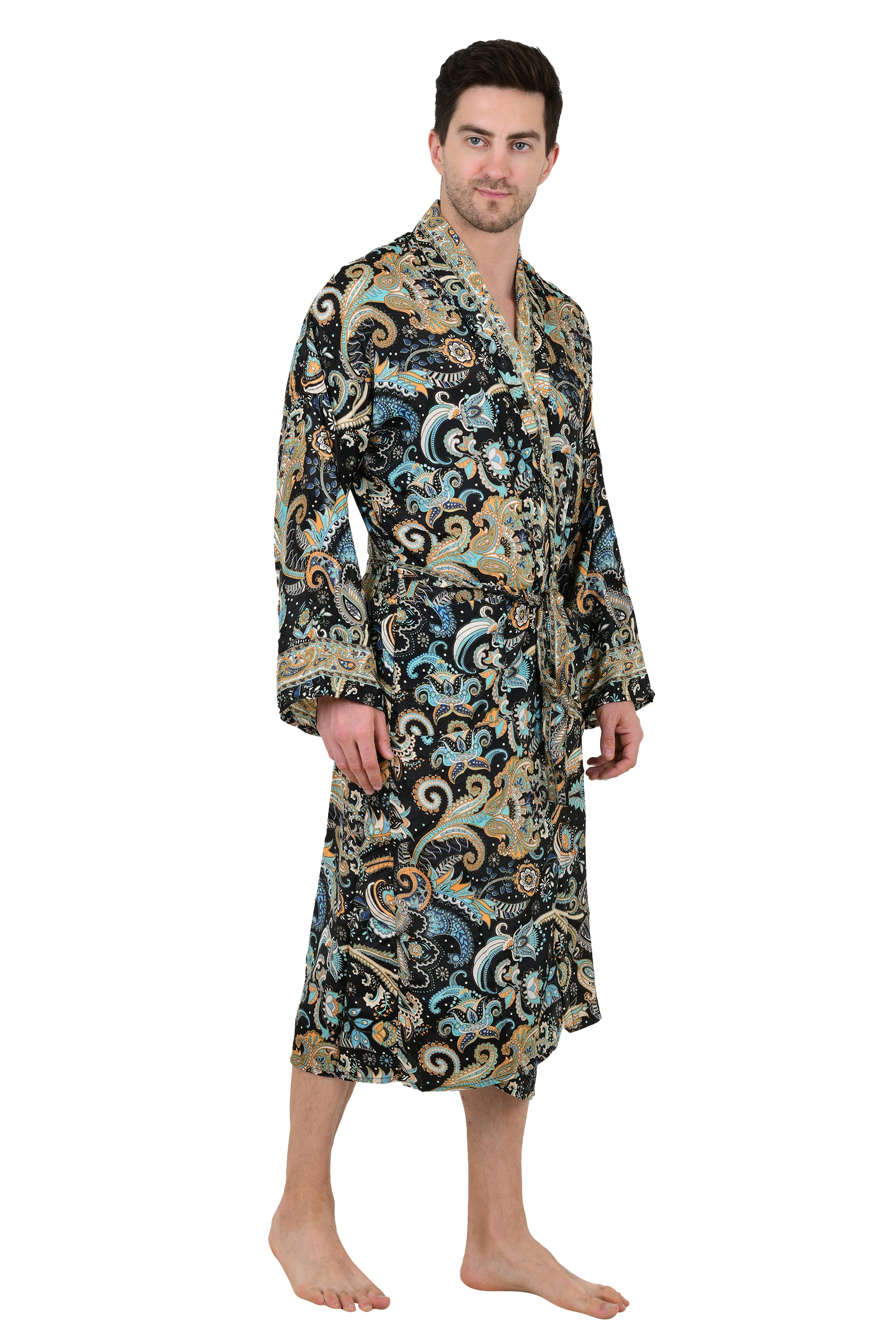 Boho Men's Soft Silk Kimono, Man Regal House Beach Robe, Persian King Floral Elegant Black Blue Hues