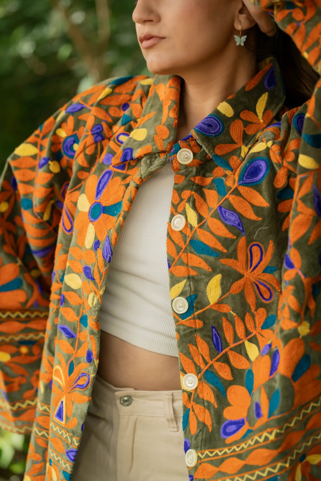 Suzani is a traditional form of embroidery that has been passed down through generations, and we are deeply committed to preserving and continuing this heritage. This jacket features newly embroidered Suzani work, created using traditional techniques that honor the craft while keeping it relevant for contemporary wear. The word Suzani comes from Central Asia and translates to needle, a reflection of the intricate handwork involved in every piece.