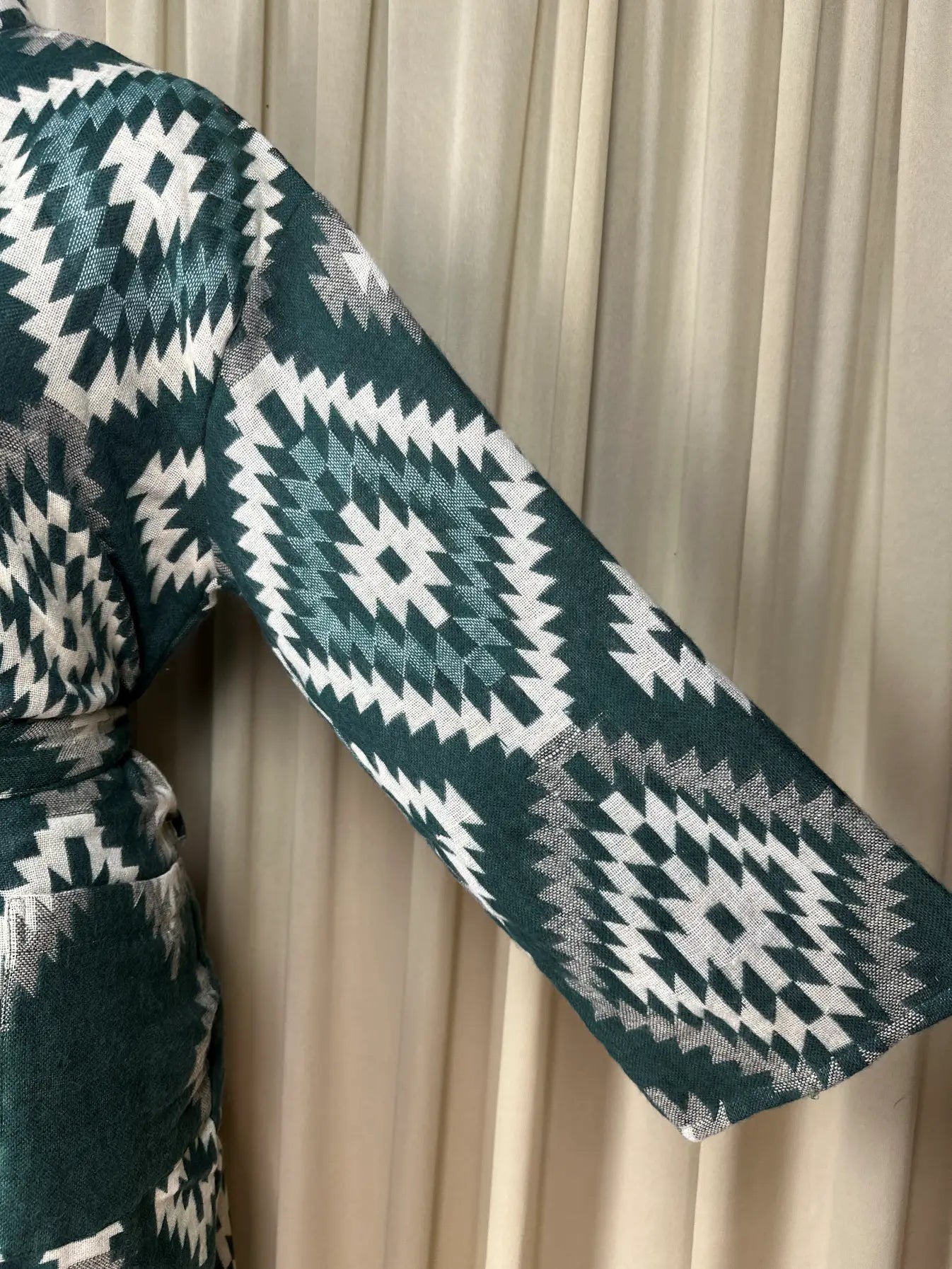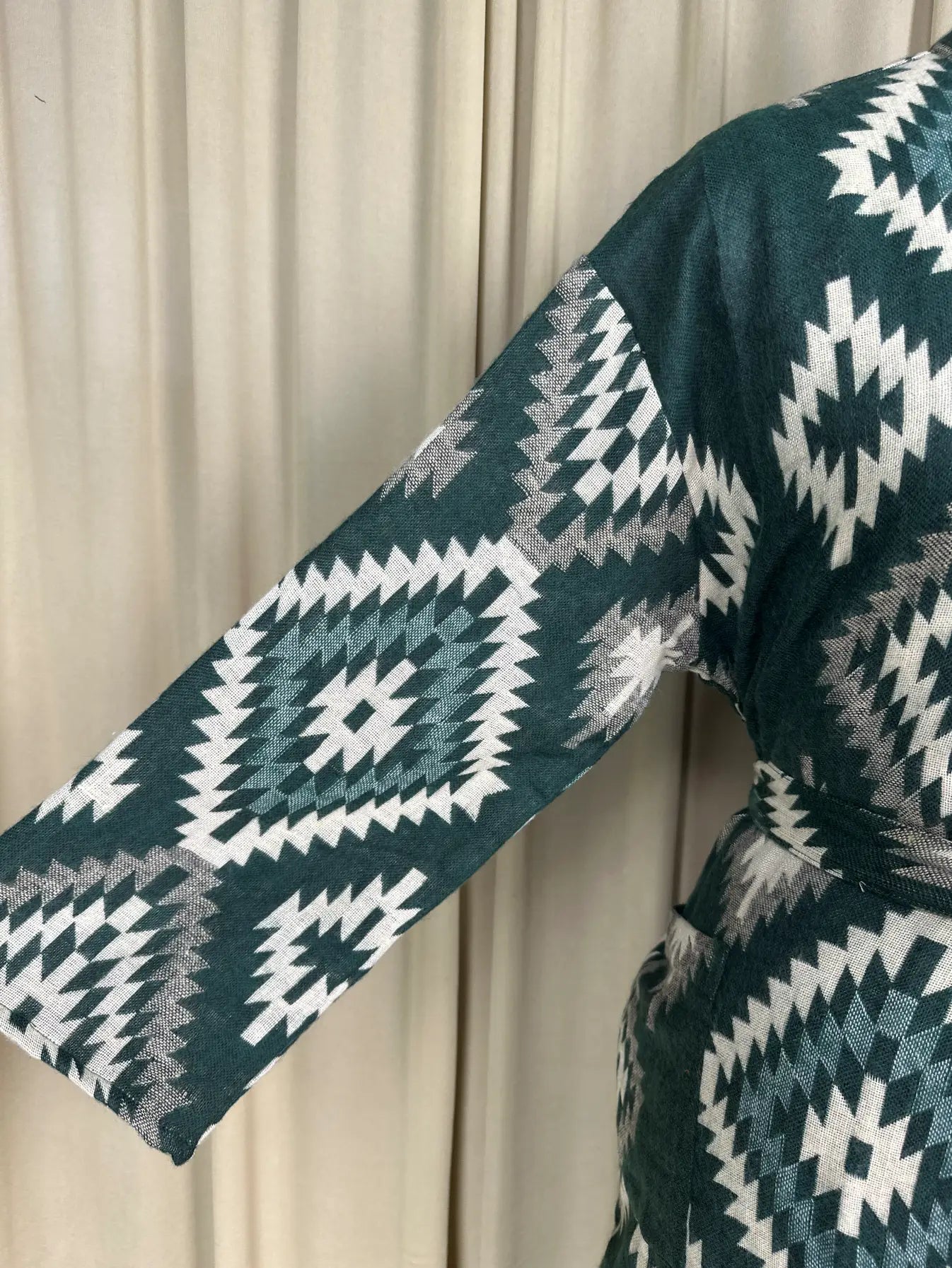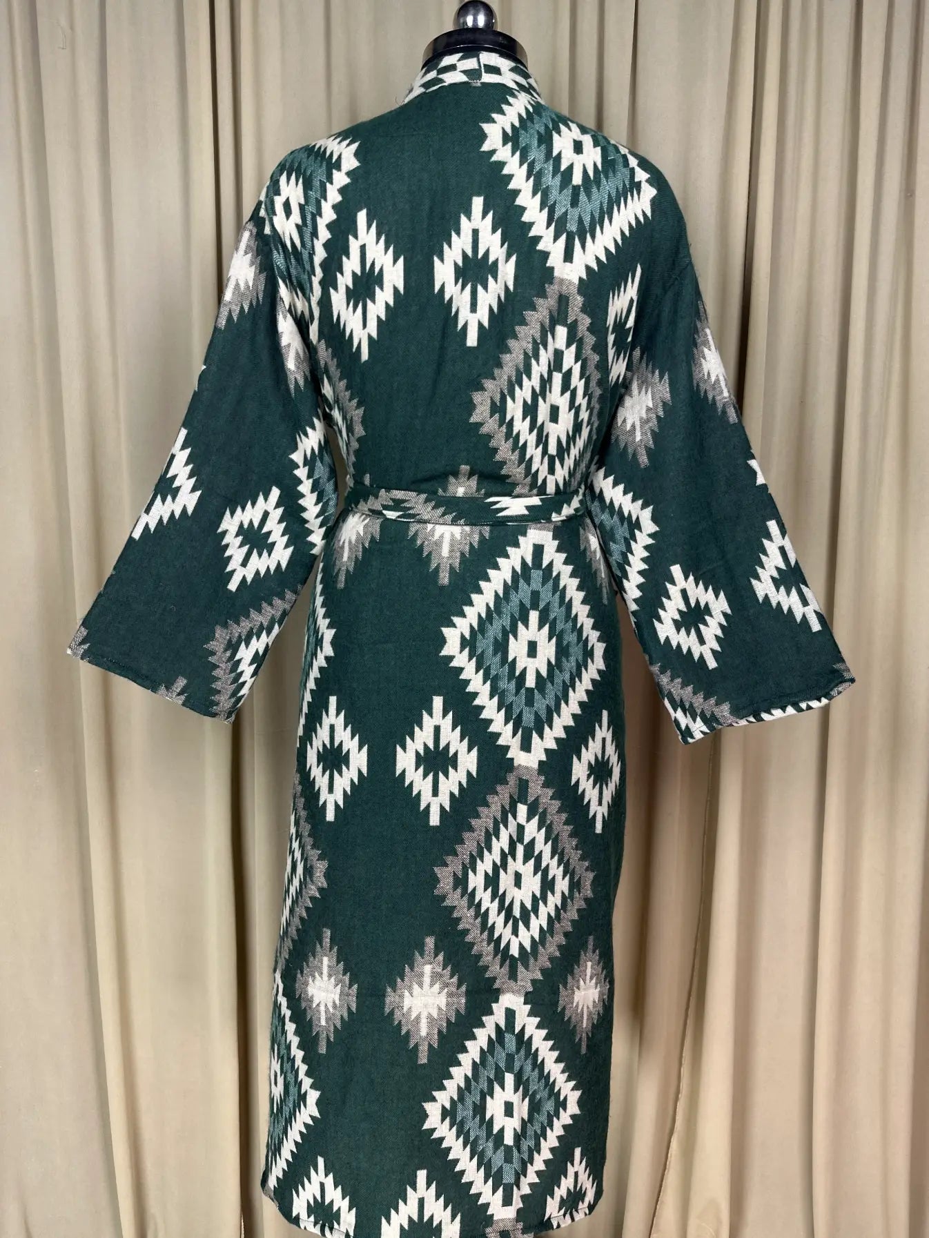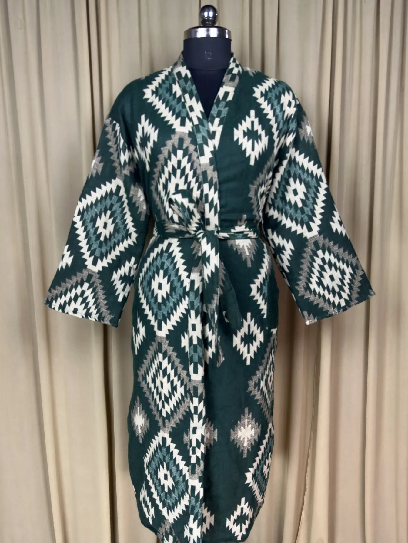 Yak Wool Blend Women Kimono Robe, Cozy Winter Romance Loungewear, Green Diamond Print Cardigan House Coat with Pockets Quirky Christmas Gift