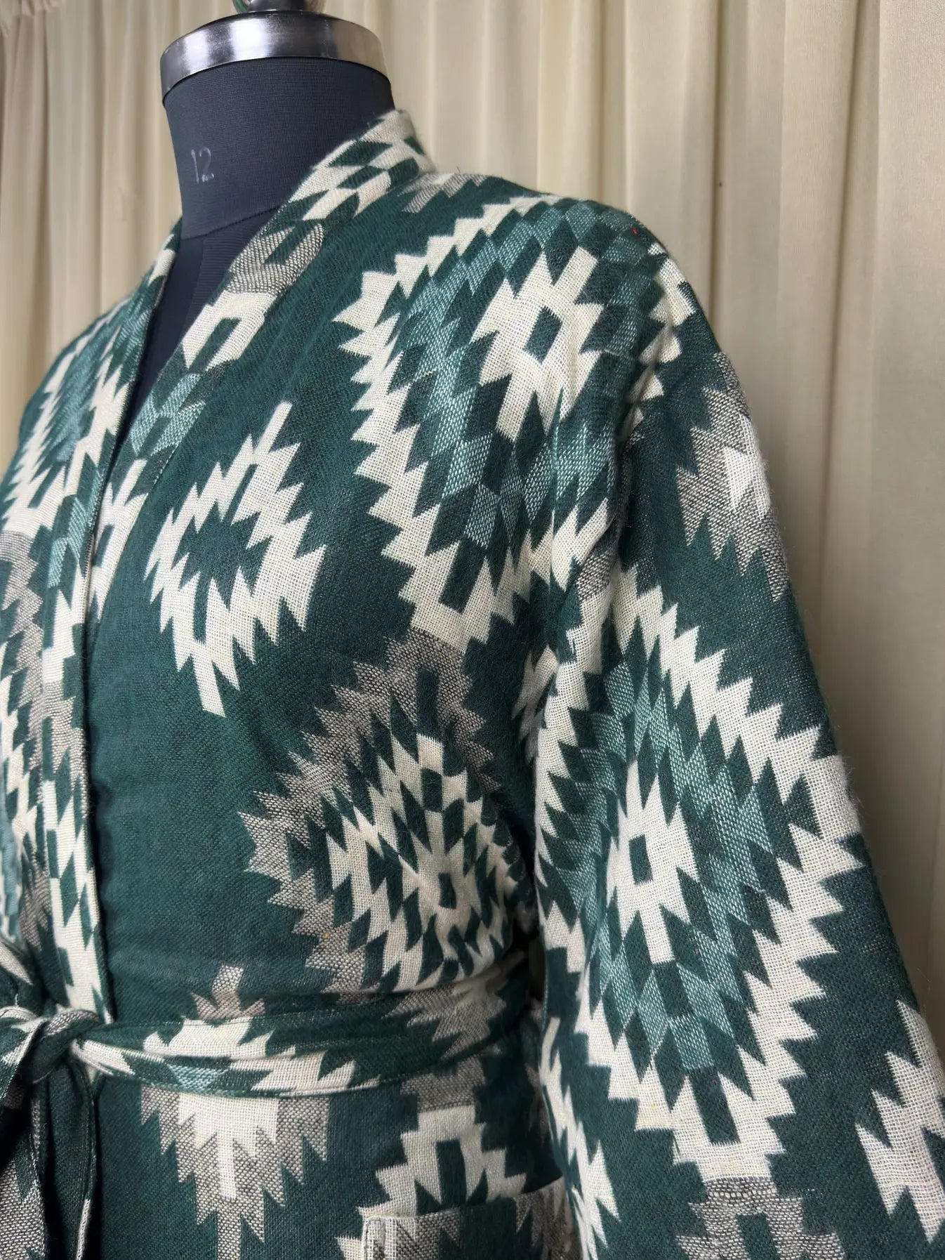 Cosy Wool Kimono in Elegant Geometric prints for this Cold Winter. Particularly known for being Super Warm and simultaneously Light Weight.
