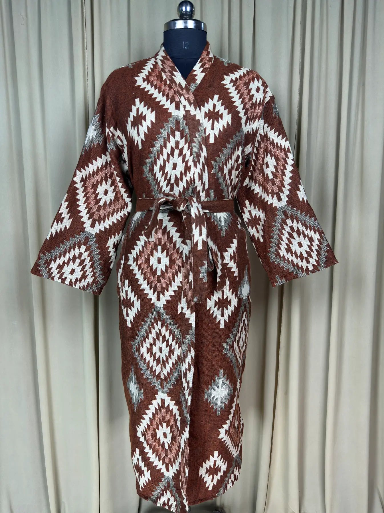 Yak Wool Blend Women Kimono Robe, Cozy Winter Romance Loungewear, Brown Diamond Print Cardigan House Coat with Pockets Quirky Christmas Gift