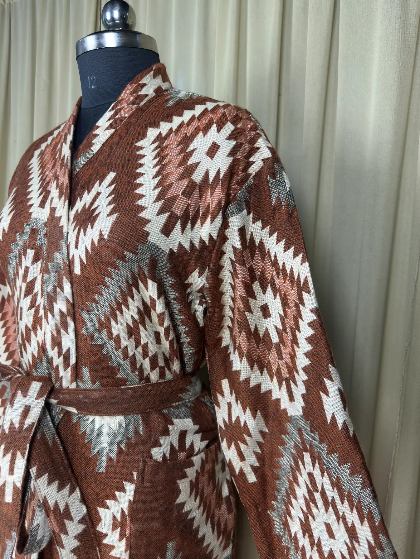 Cosy Wool Kimono in Elegant Geometric prints for this Cold Winter. Particularly known for being Super Warm and simultaneously Light Weight.