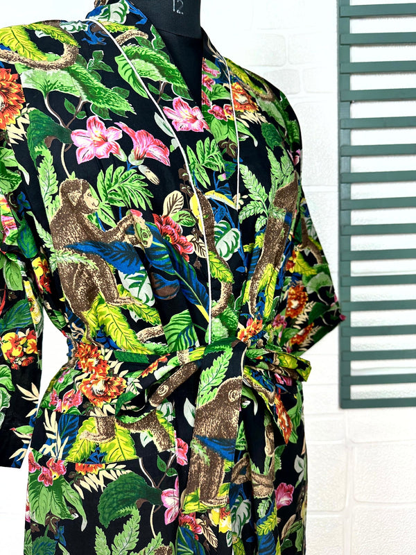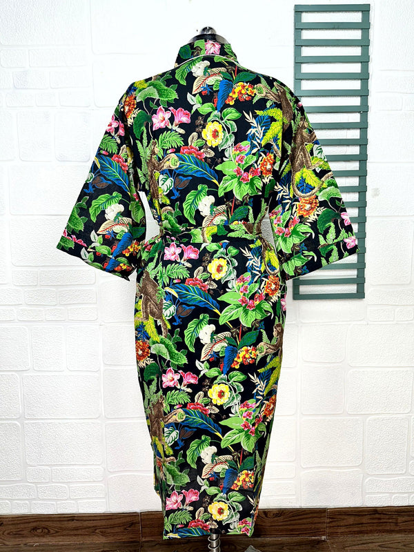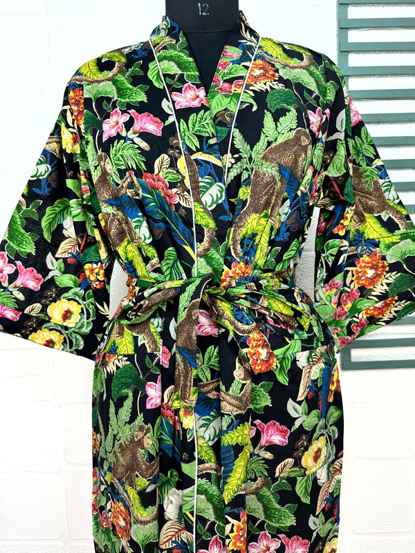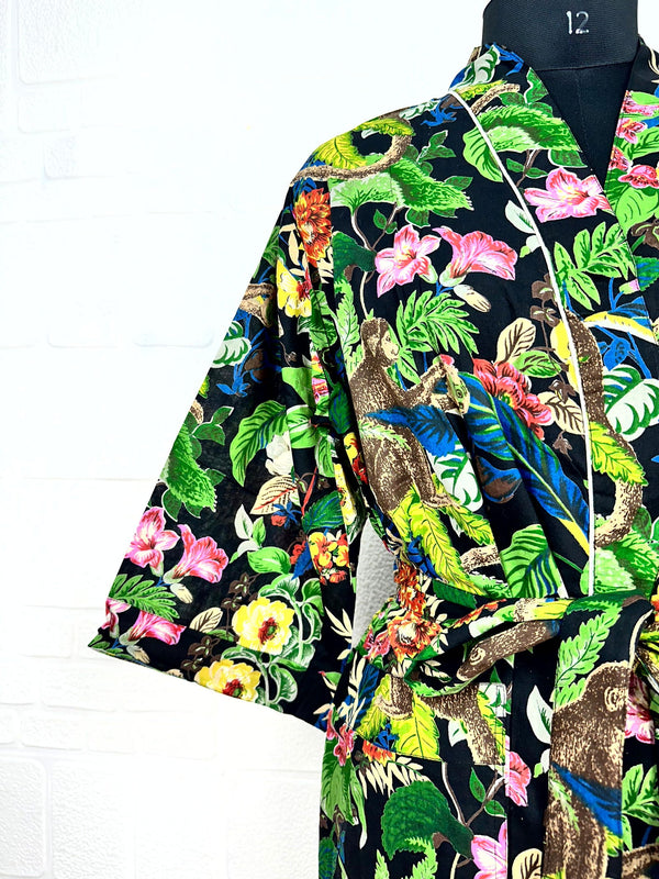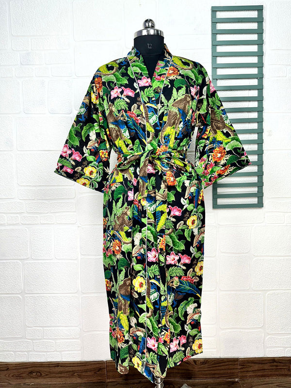 Boho-Kimono aus Baumwolle, Hausmantel, indisches handbedrucktes Schmetterlings-Blumenmuster, leichtes Sommer-Luxus-Strandurlaubs-Yacht-Cover-Up, atemberaubendes Kleid