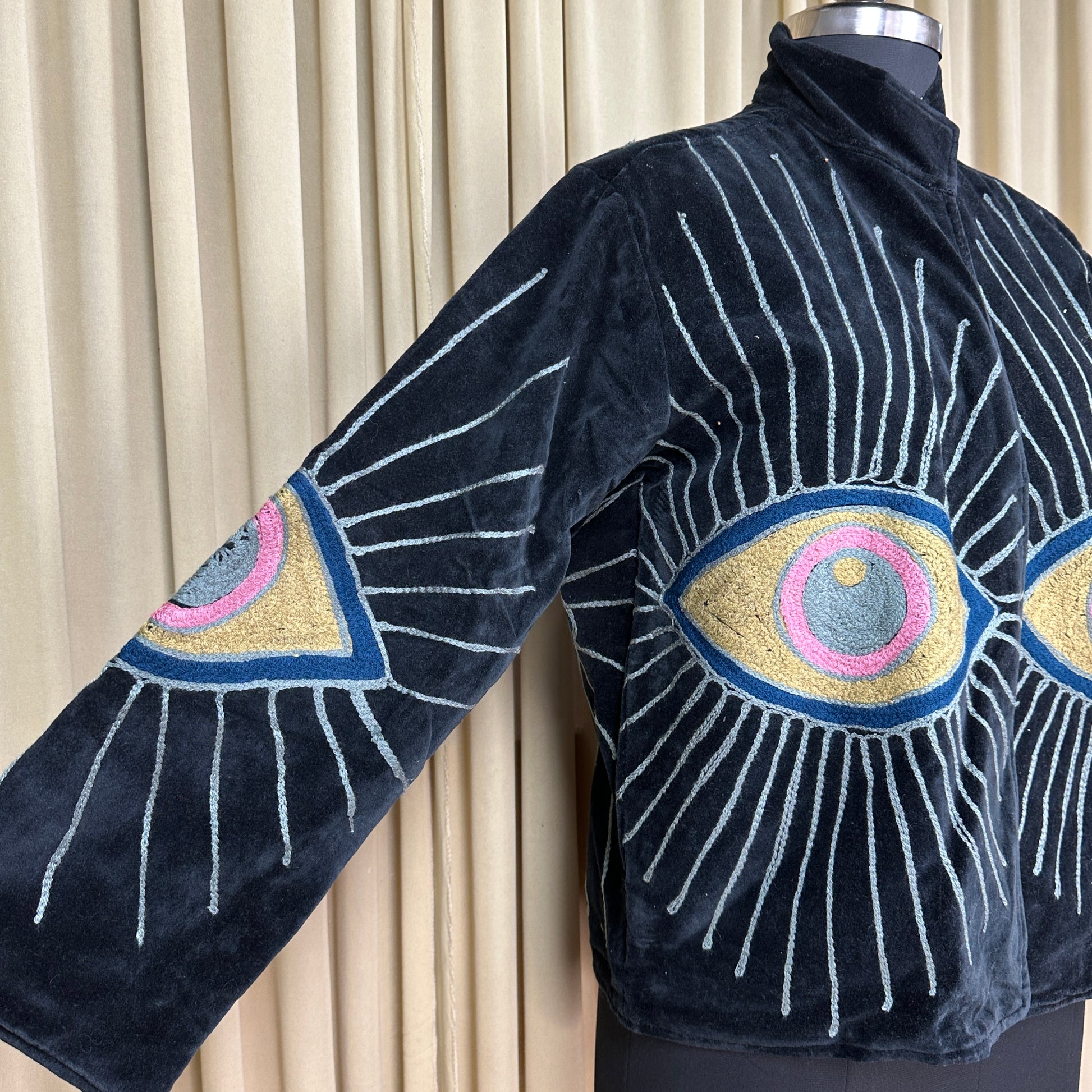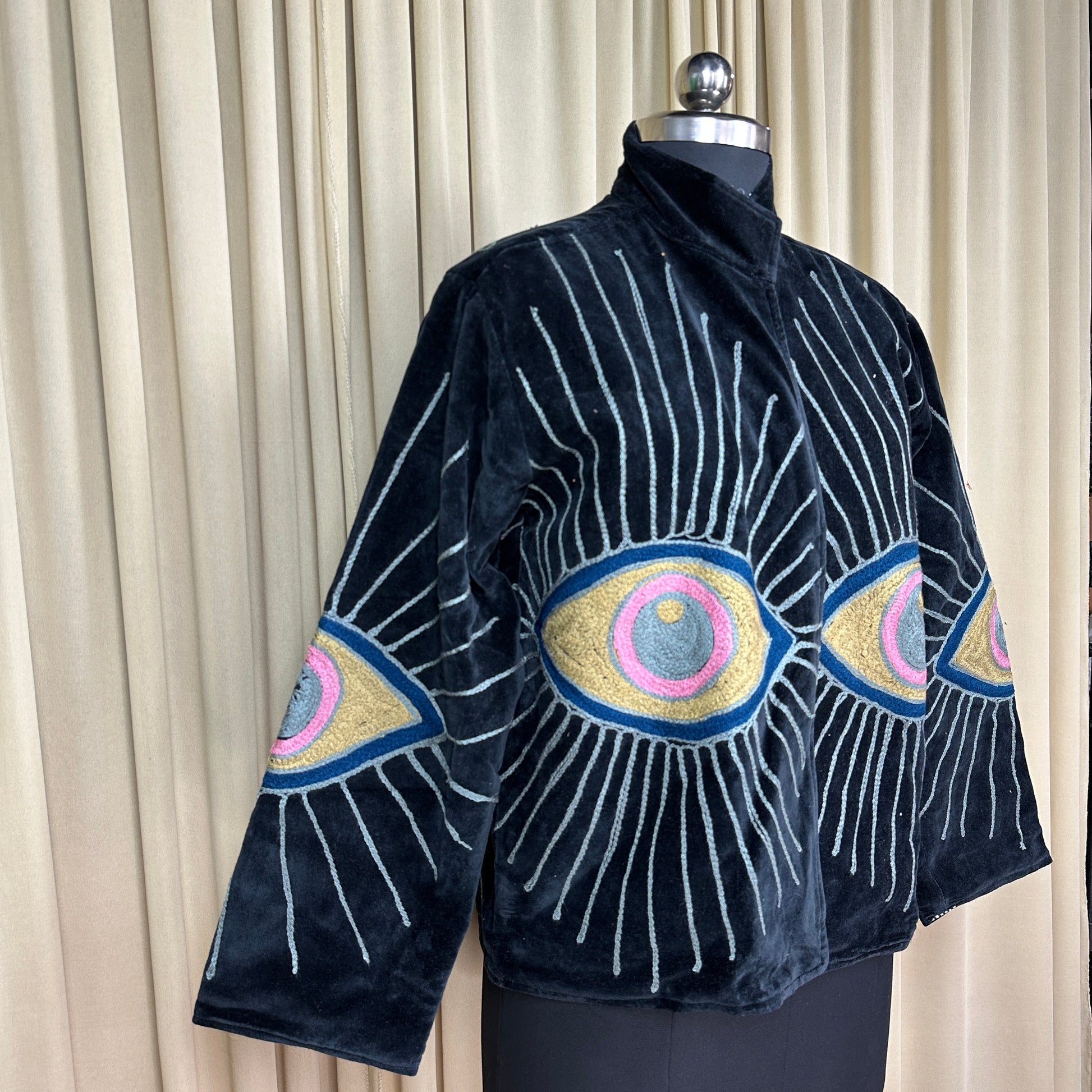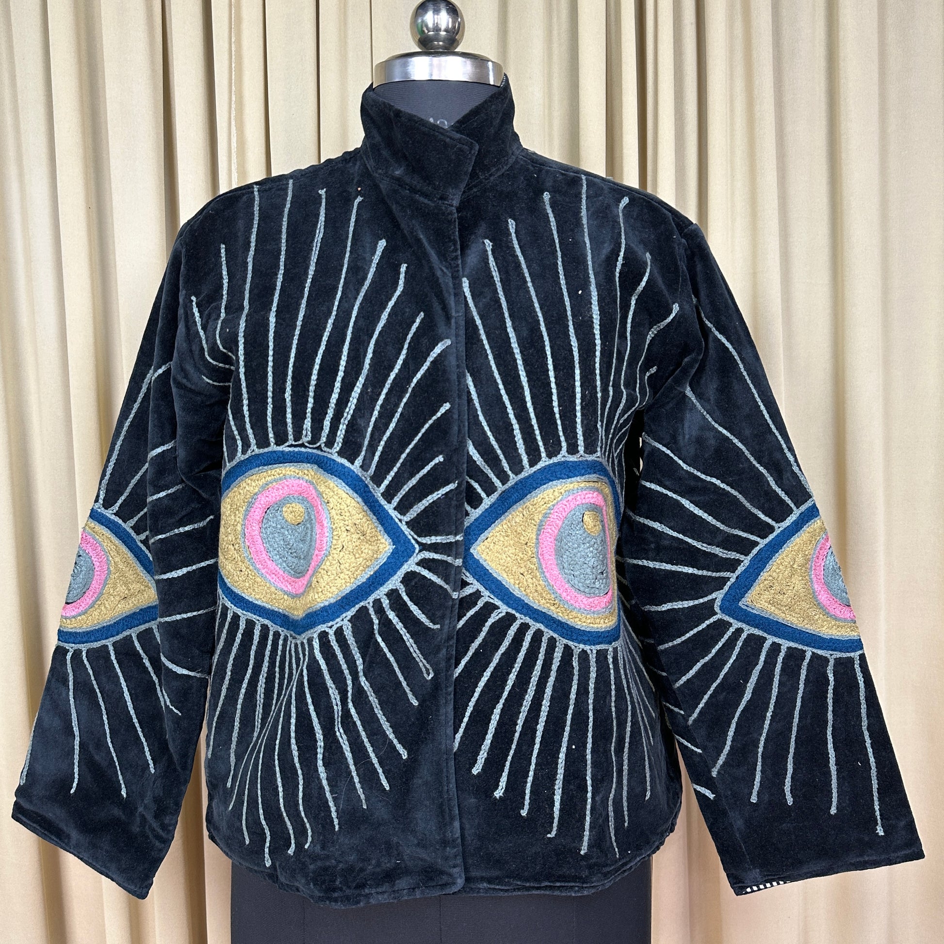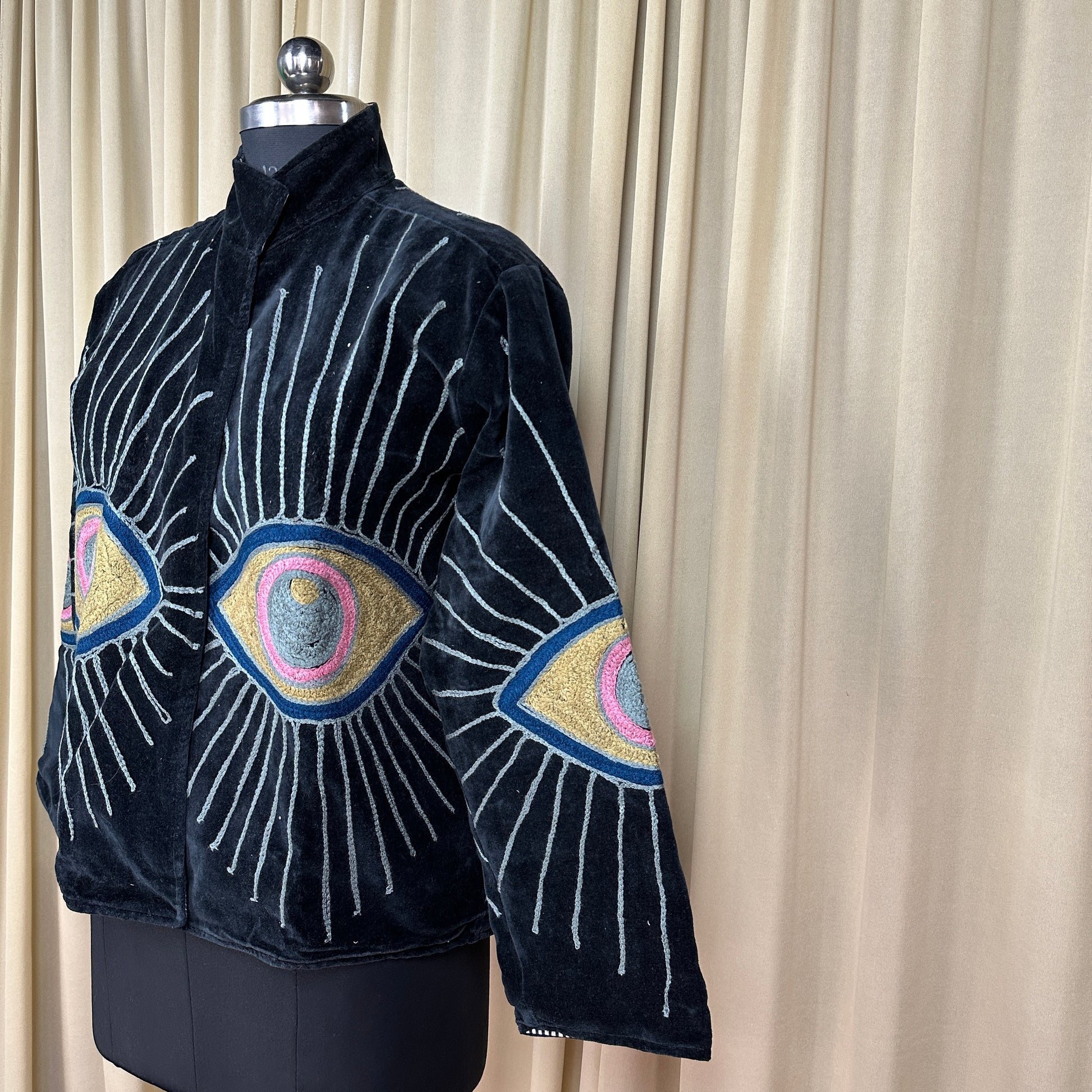 Boho Hand Embroidered Velvet Suzani Jacket | Black Geometric Open Front Coat Winter Wear Free Size Retro Chic Free Size Robe Blazer for Her
