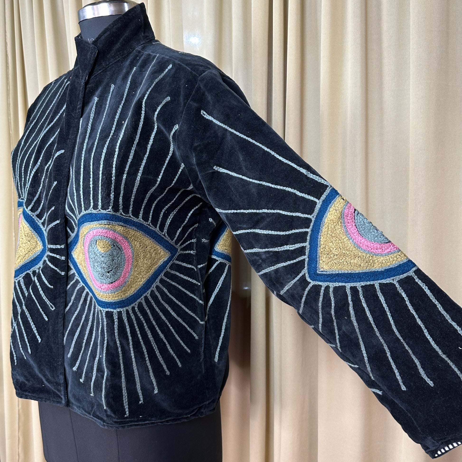 Wrap yourself in timeless artistry with this handcrafted Hand Embroidered Velvet Suzani Jacket, a stunning blend of boho charm and royal elegance. Each piece is meticulously embroidered by skilled artisans, creating a one-of-a-kind Geometric pattern that transforms this jacket into wearable art. The rich Black velvet adds depth, luxury, and a soft drape, making it perfect for elevating everyday outfits or adding statement style to special occasions.