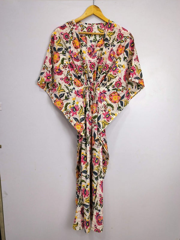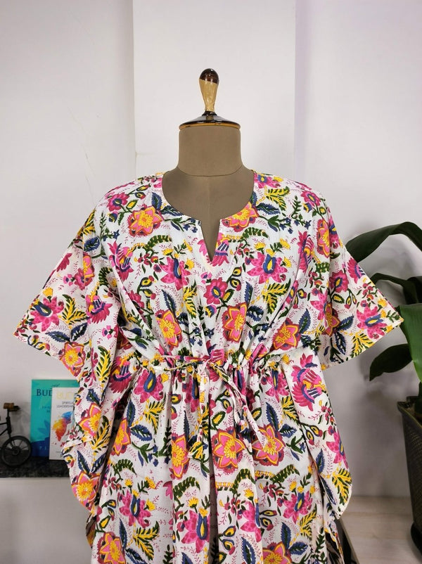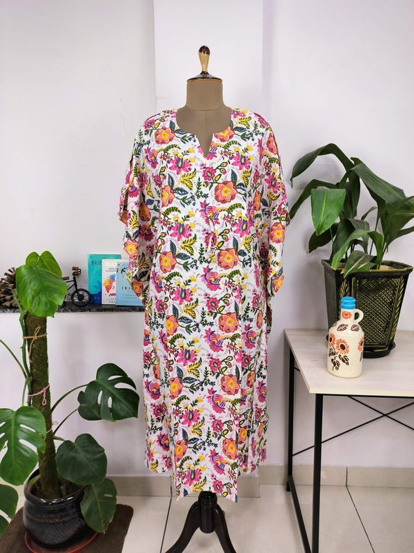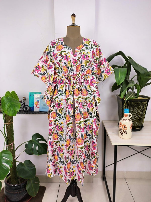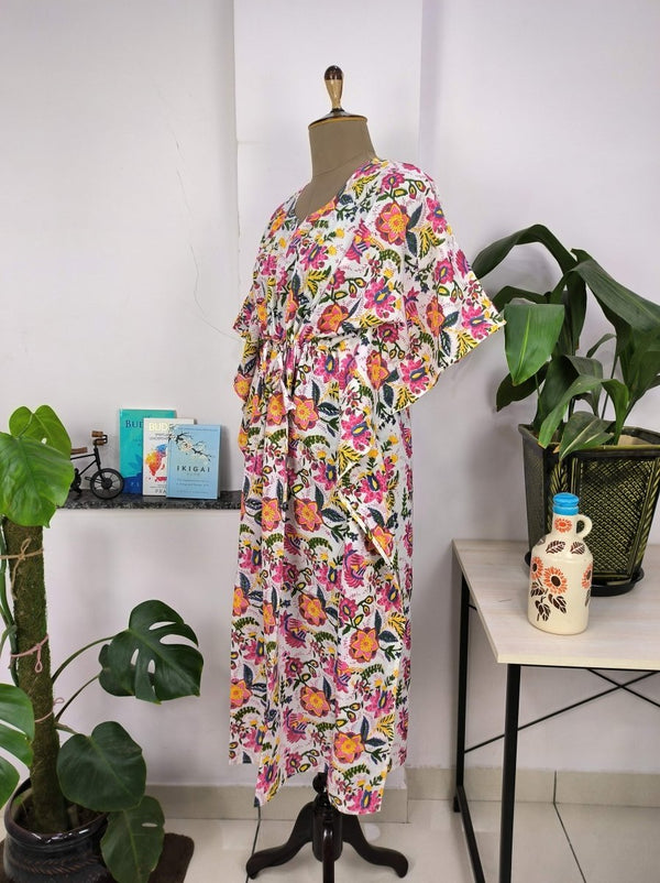 Kaftan-Kleid im Boho-Stil | Indische handbedruckte weiße und rosa Blumenblüten | Atmungsaktiver, leichter Baumwollstoff, bequemer, schicker Sommer-Look
