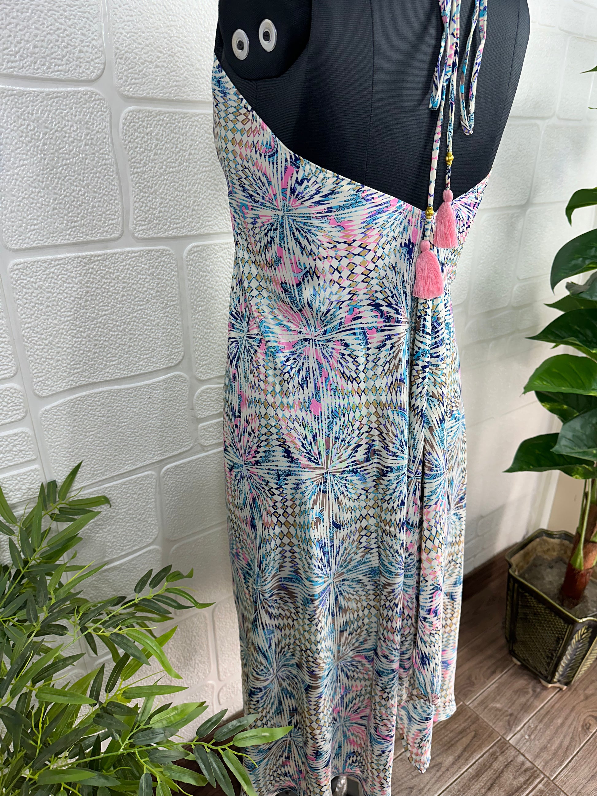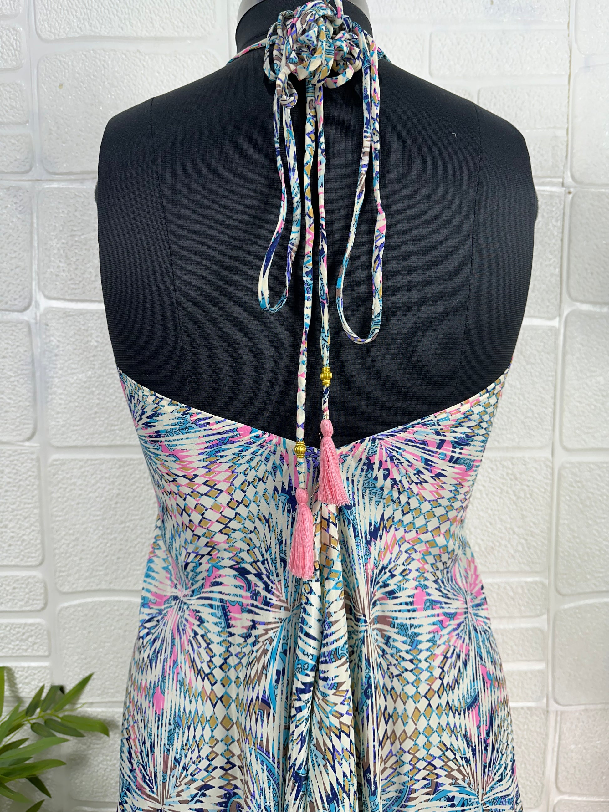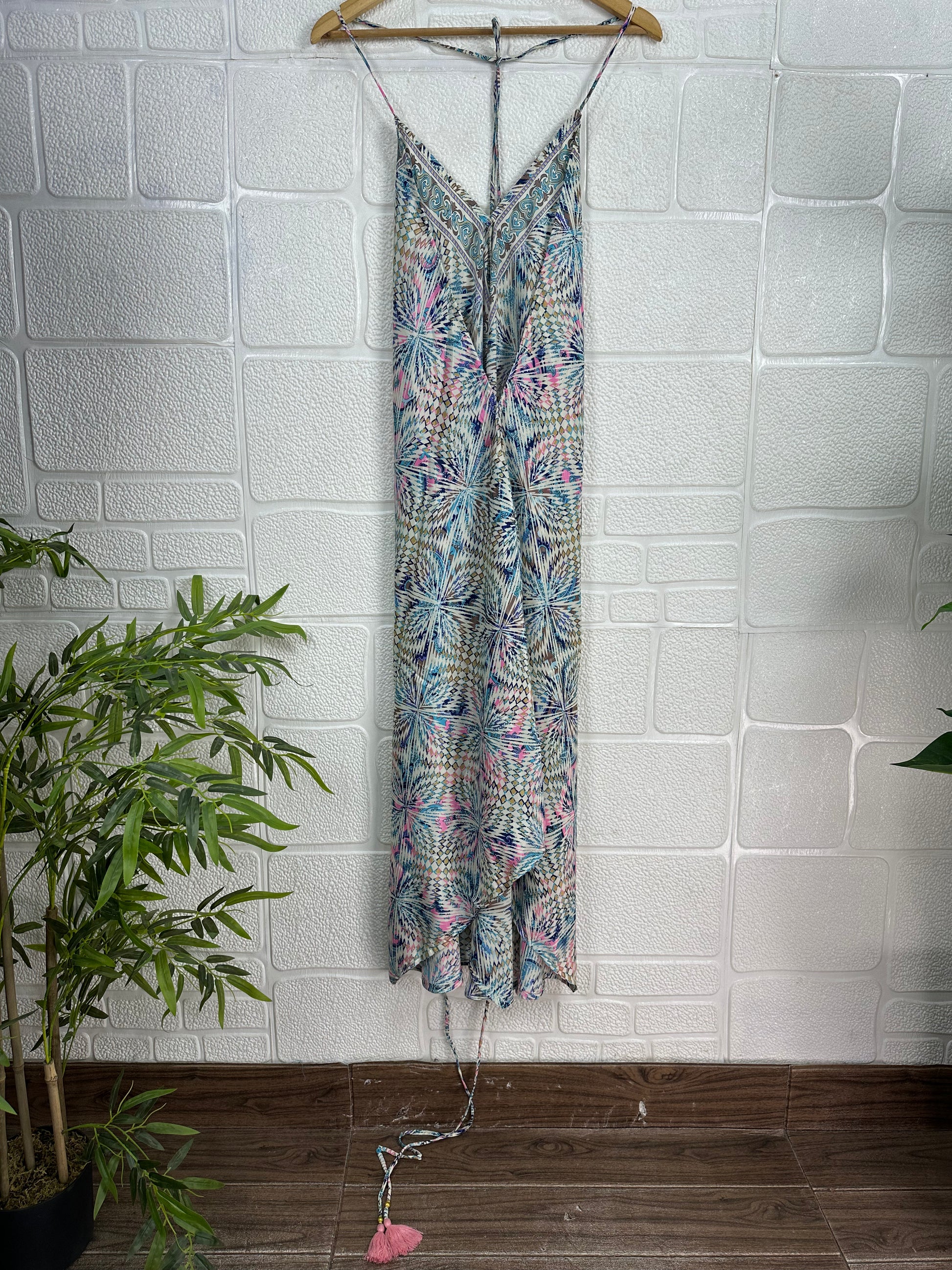 Handmade Maxi Halter Dress, a stunning blend of vintage charm and modern elegance, perfect for any occasion. This handmade artisanal piece is inspired by the vibrant 70s, featuring a beautiful floral pattern that captures the essence of spring and summer. This dress is designed to make you stand out whether you're at the beach, a wedding, or a cocktail party.