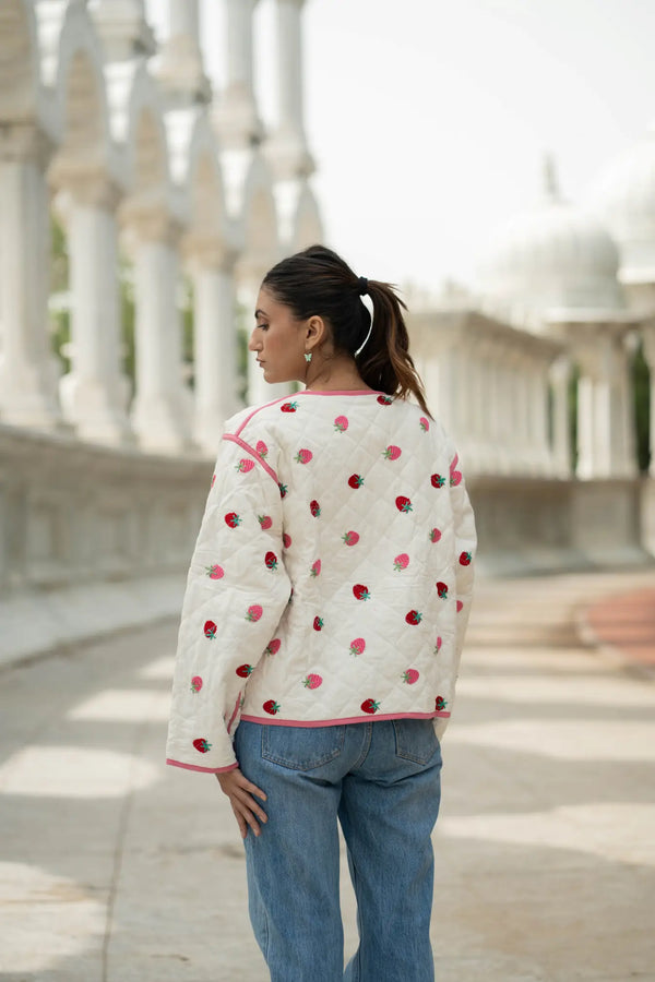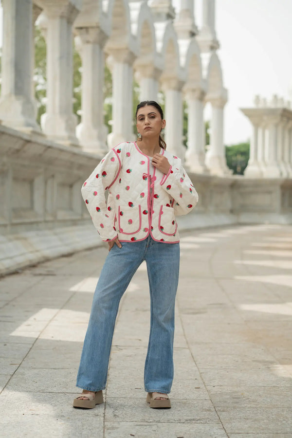 This white cotton quilted Kantha jacket is a celebration of slow fashion, blending traditional hand quilting with a modern boho chic silhouette. Designed as a short kimono-style coat, it features delicate strawberry hand embroidery and a striking pattern on one side, creating a polished yet artistic statement for everyday wear.