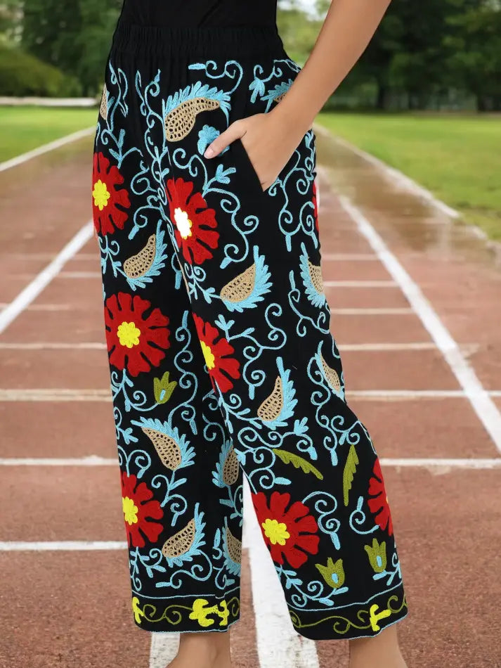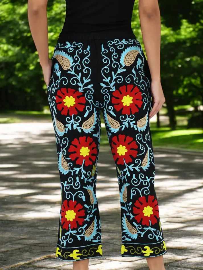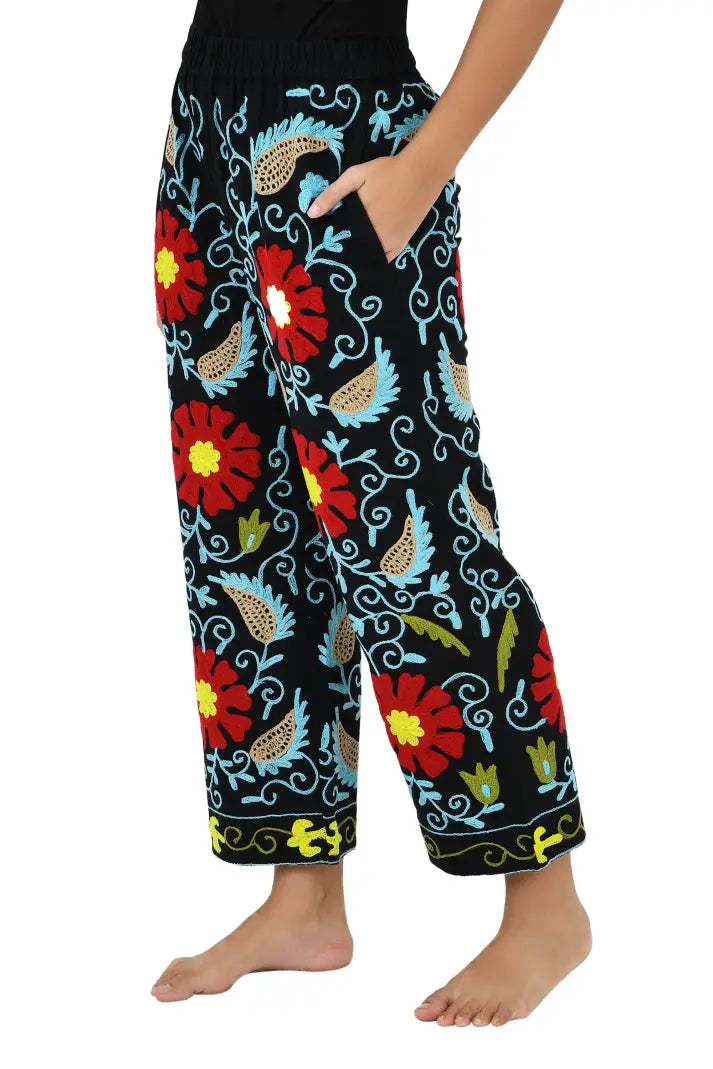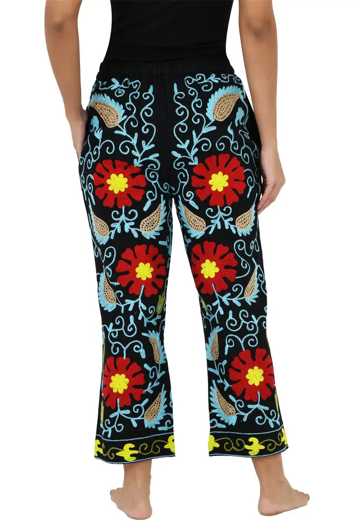 Boho Harem Pants Gift for Her – Handmade Embroidered Suzani Festival Pants, Boho Hippie Lounge Pajamas with Pockets, Unique Floral Yoga Pant