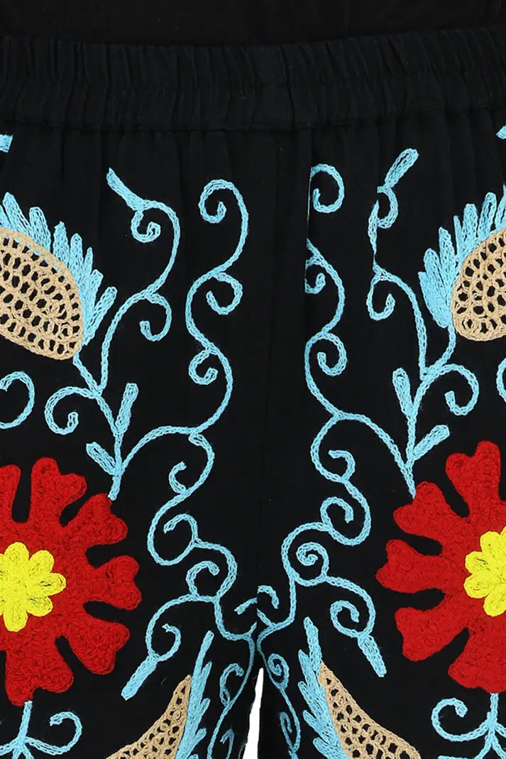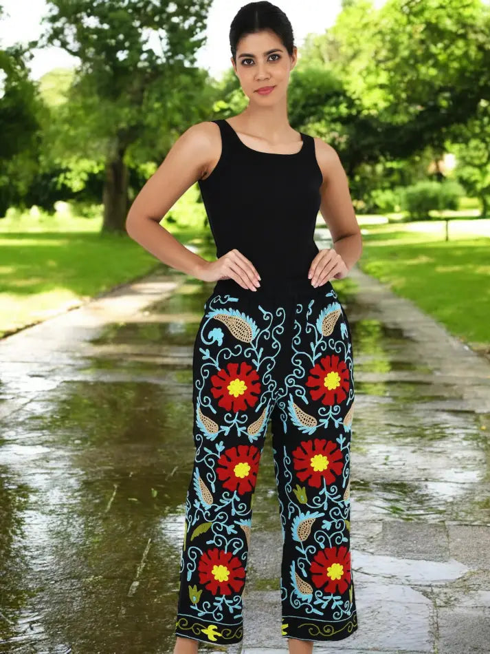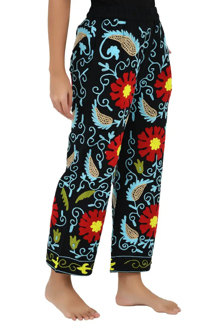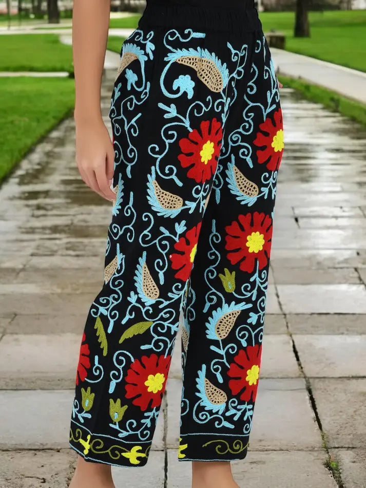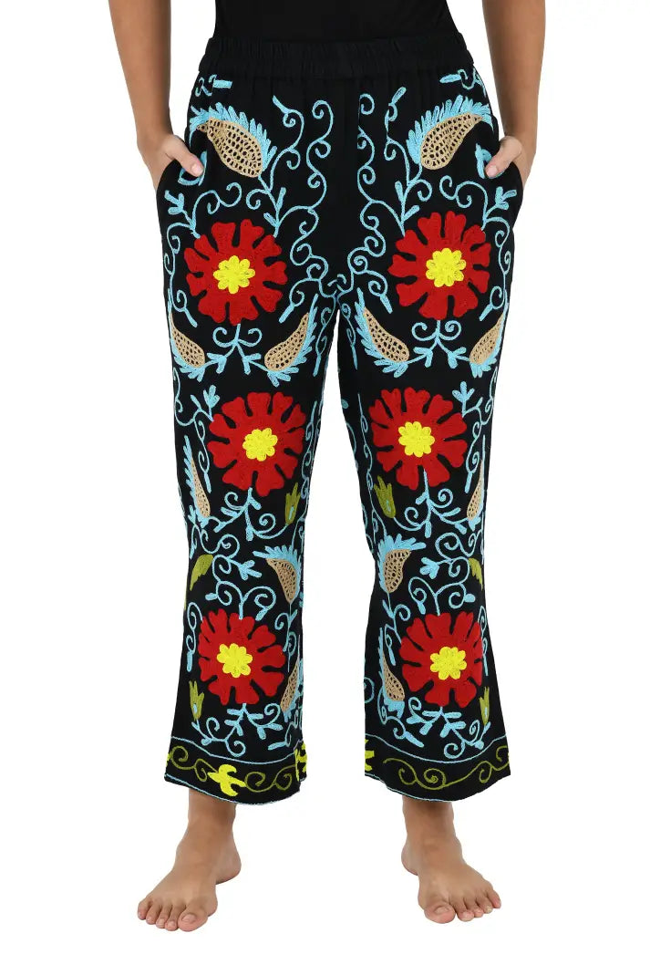 Boho Harem Pants Gift for Her – Handmade Embroidered Suzani Festival Pants, Boho Hippie Lounge Pajamas with Pockets, Unique Floral Yoga Pant