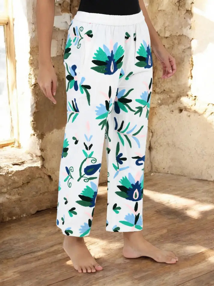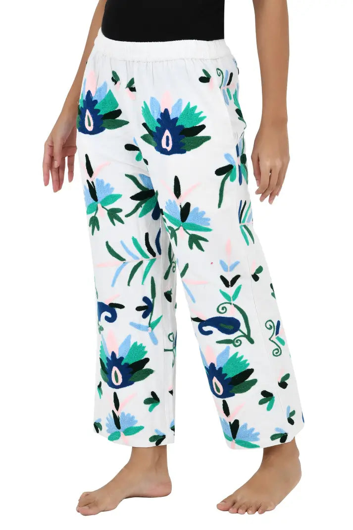 Boho Harem Pants Gift for Her – Handmade Embroidered Suzani Festival Pants, Boho Hippie Lounge Pajamas with Pockets, Unique Floral Yoga Pant