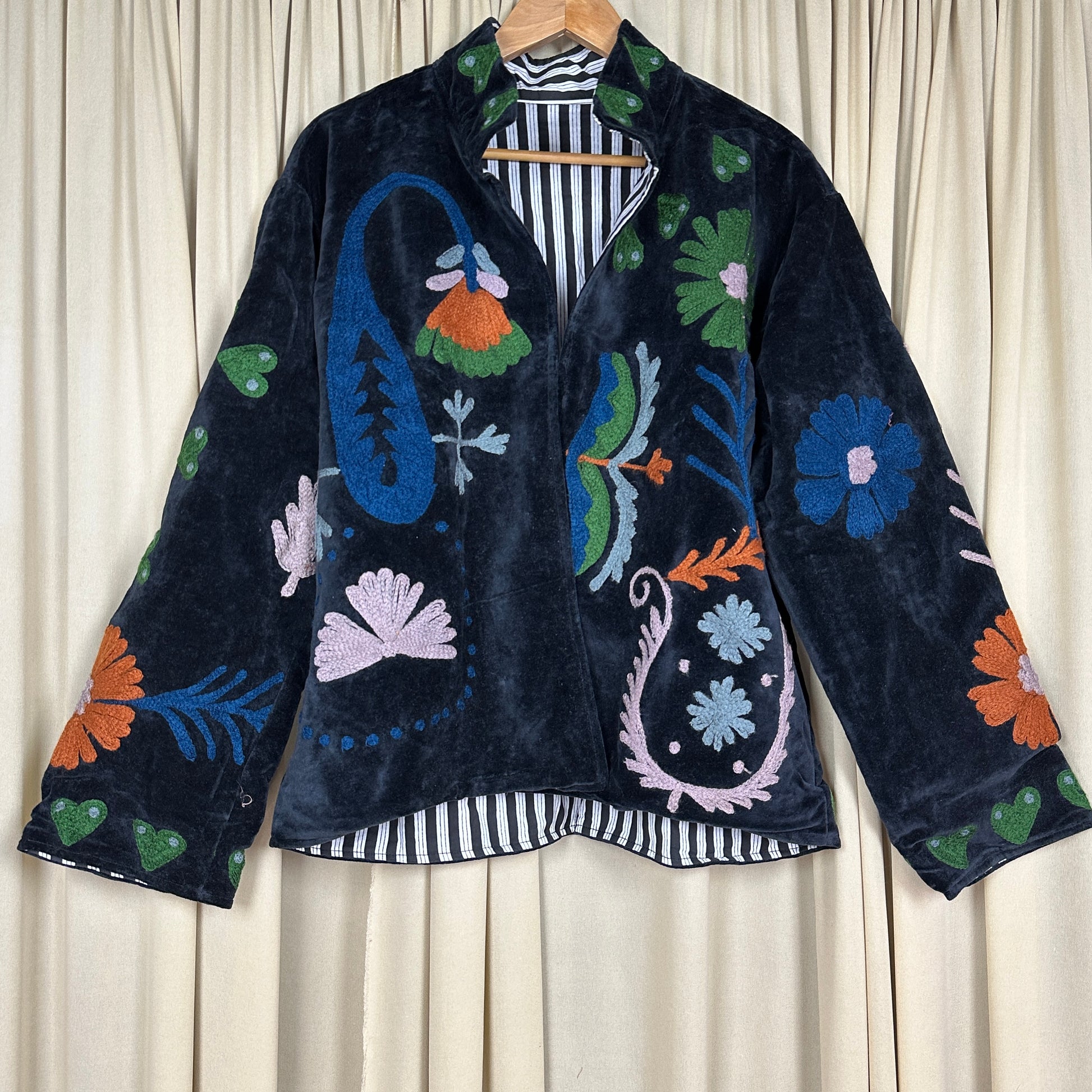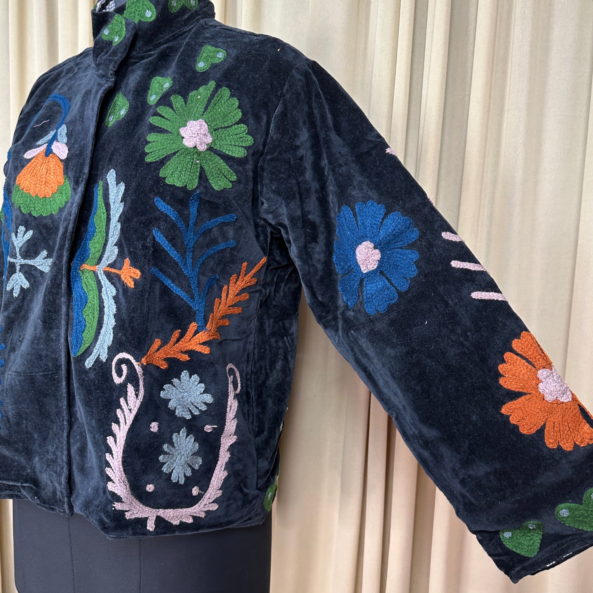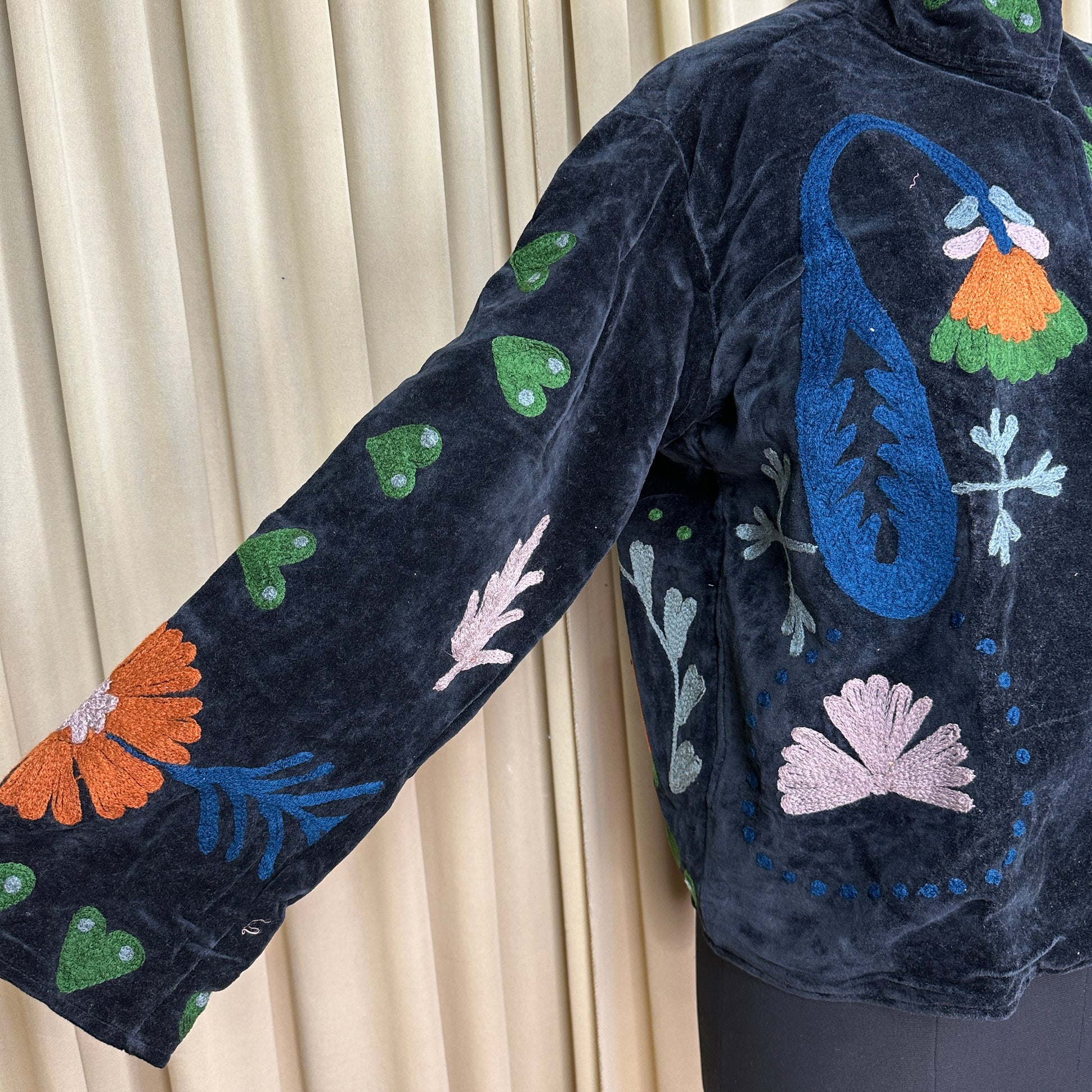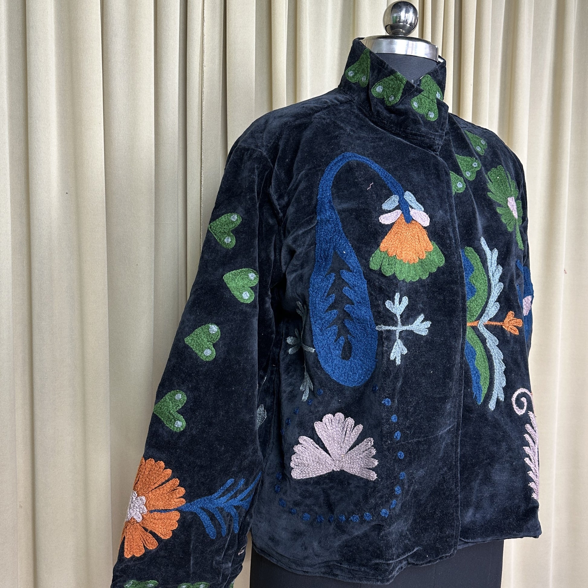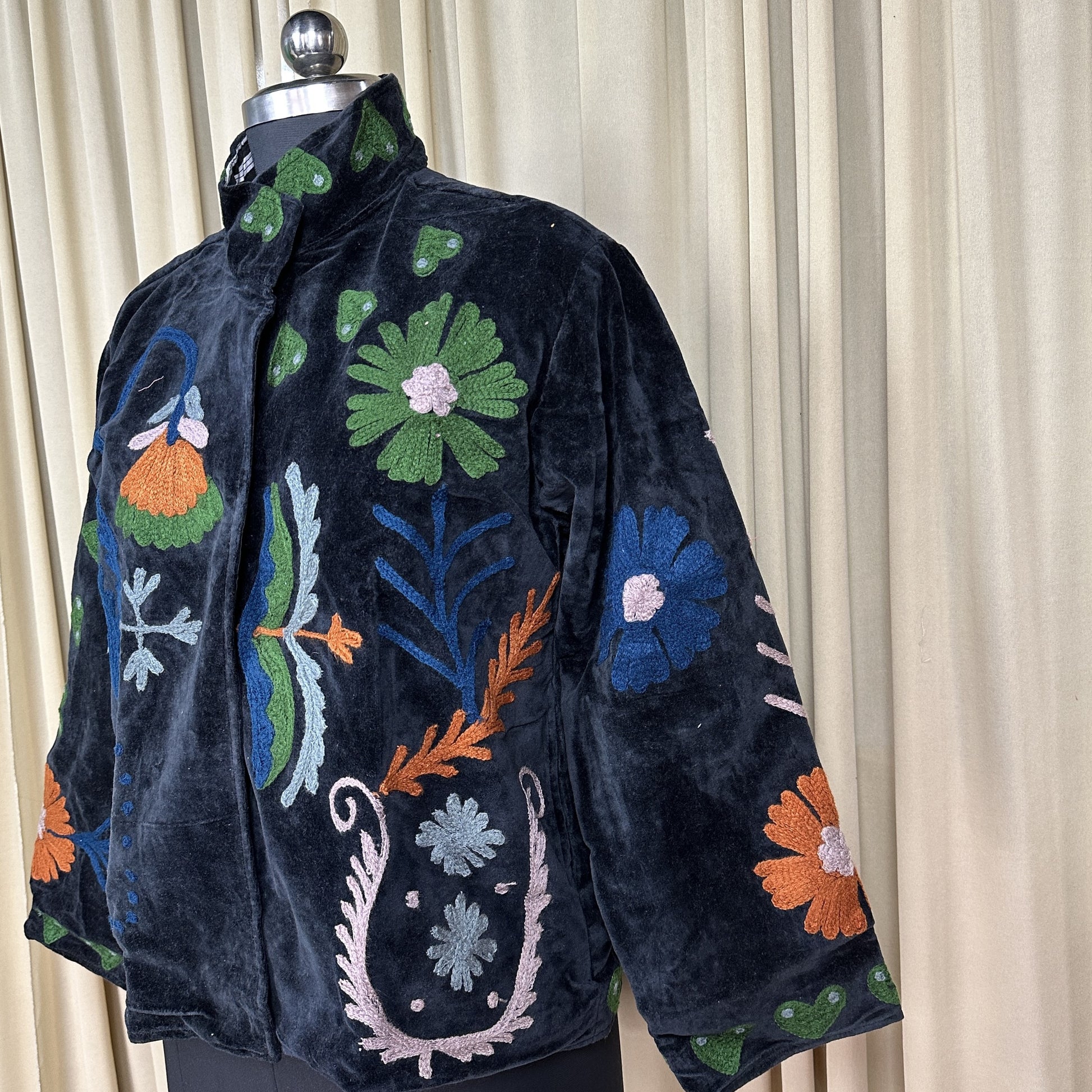 Wrap yourself in timeless artistry with this handcrafted Hand Embroidered Velvet Suzani Jacket, a stunning blend of boho charm and royal elegance. Each piece is meticulously embroidered by skilled artisans, creating a one-of-a-kind floral pattern that transforms this jacket into wearable art. The rich Black velvet adds depth, luxury, and a soft drape, making it perfect for elevating everyday outfits or adding statement style to special occasions.