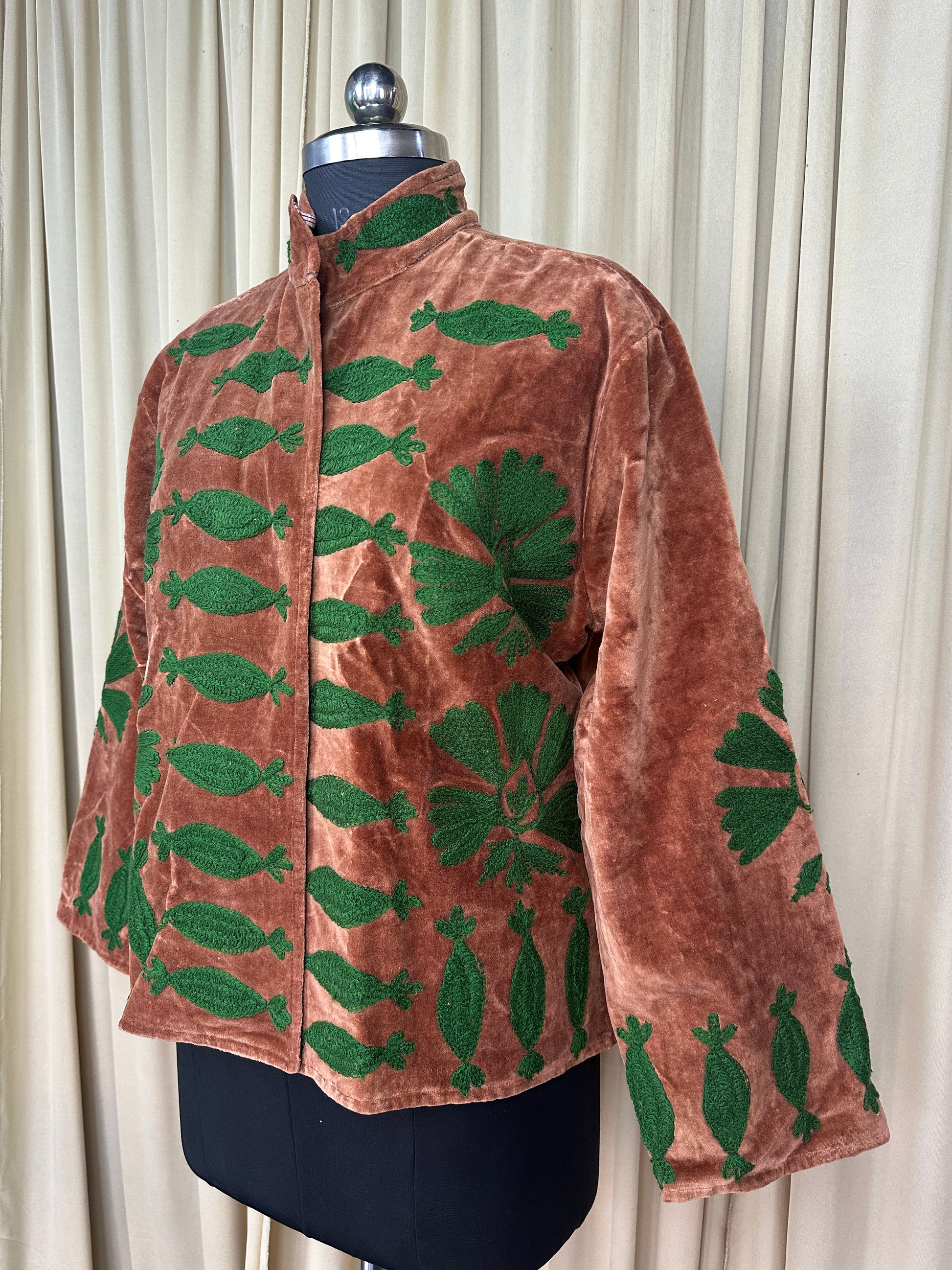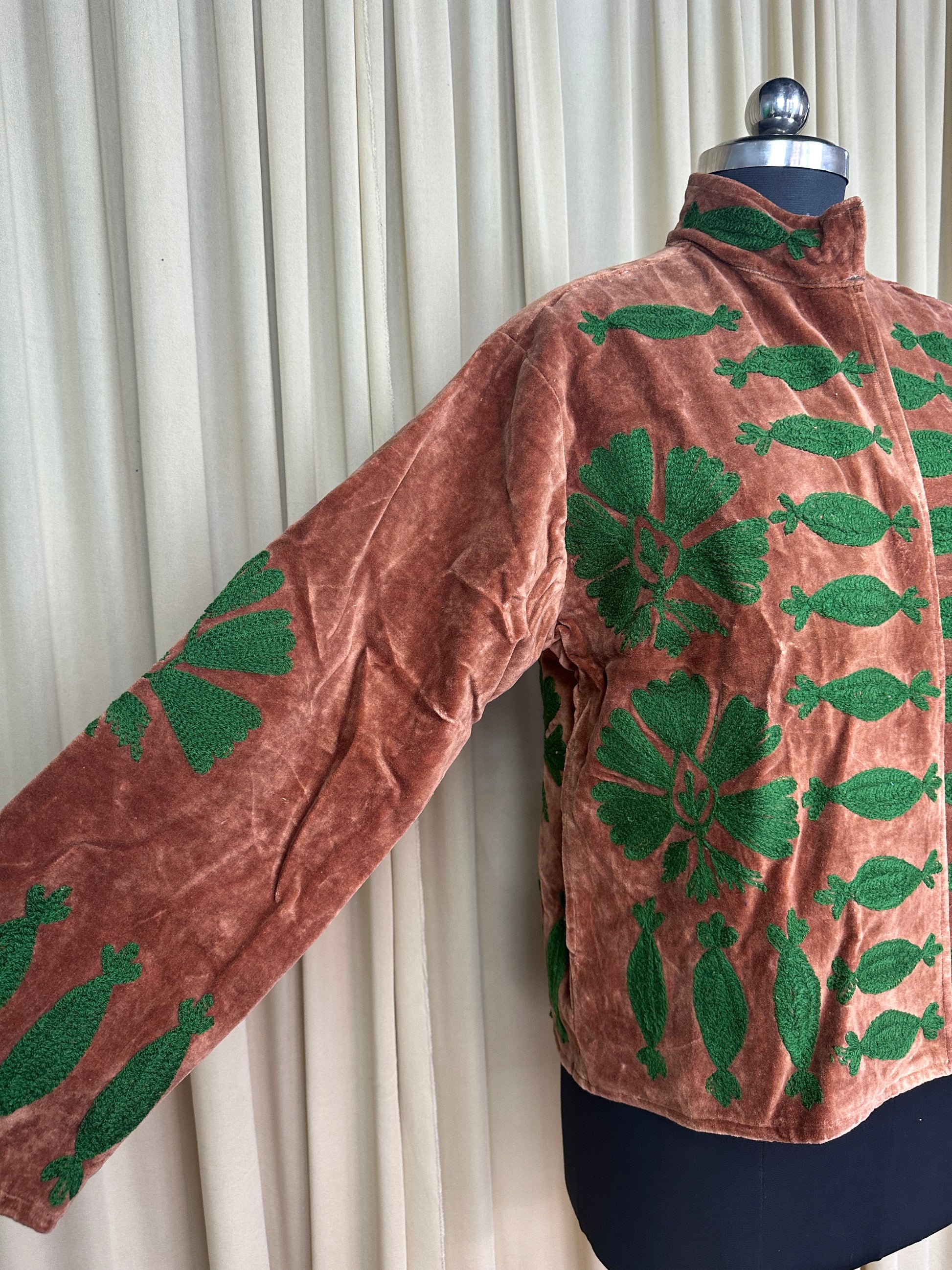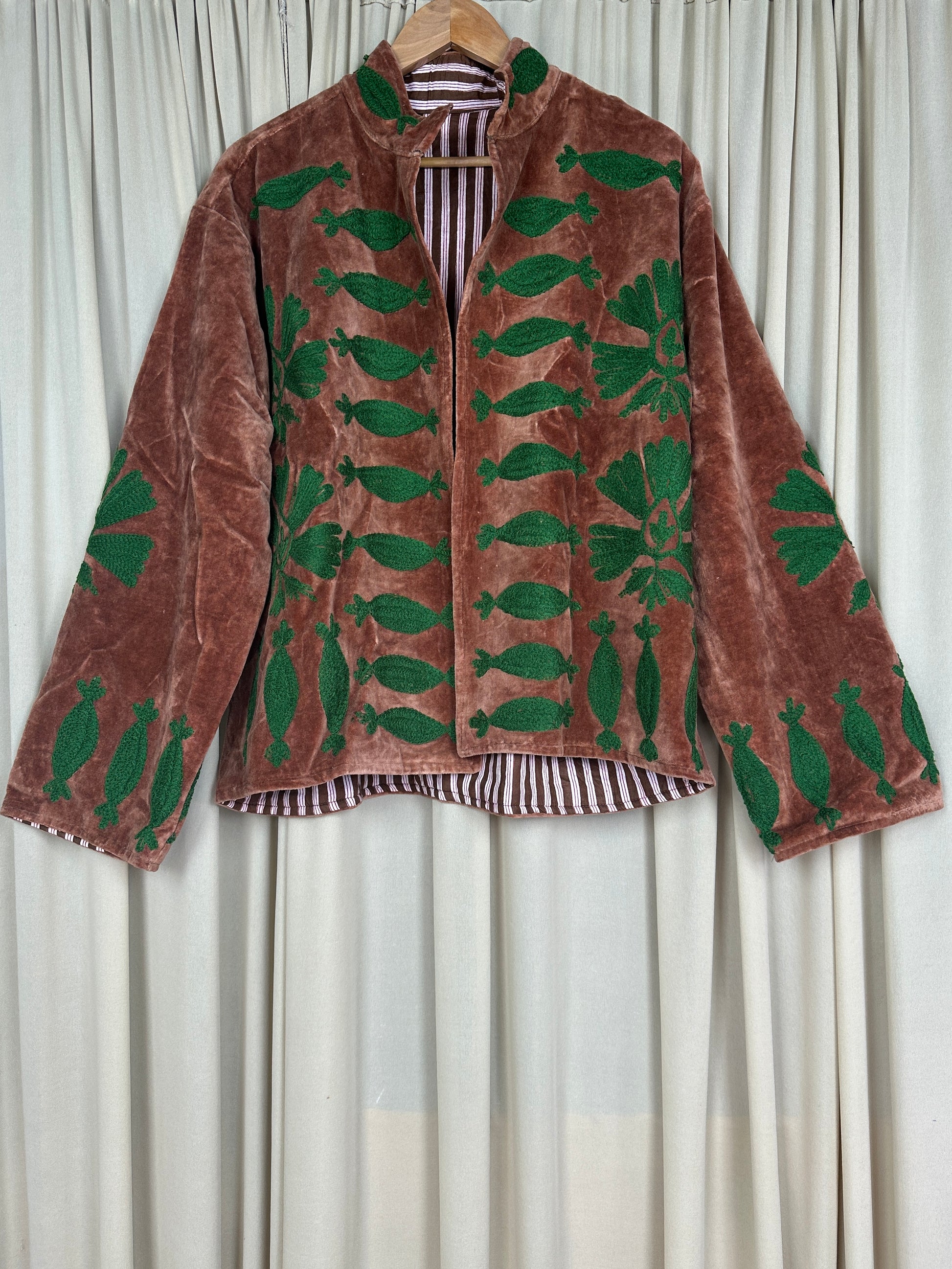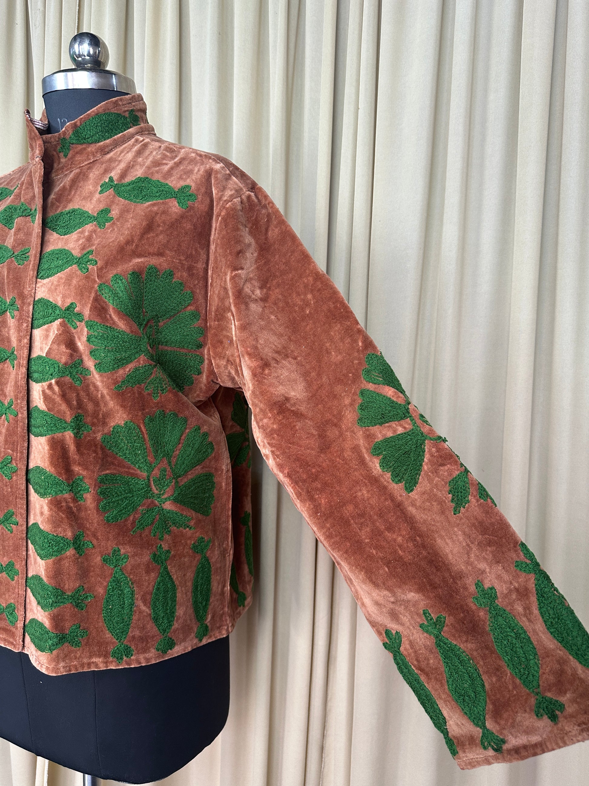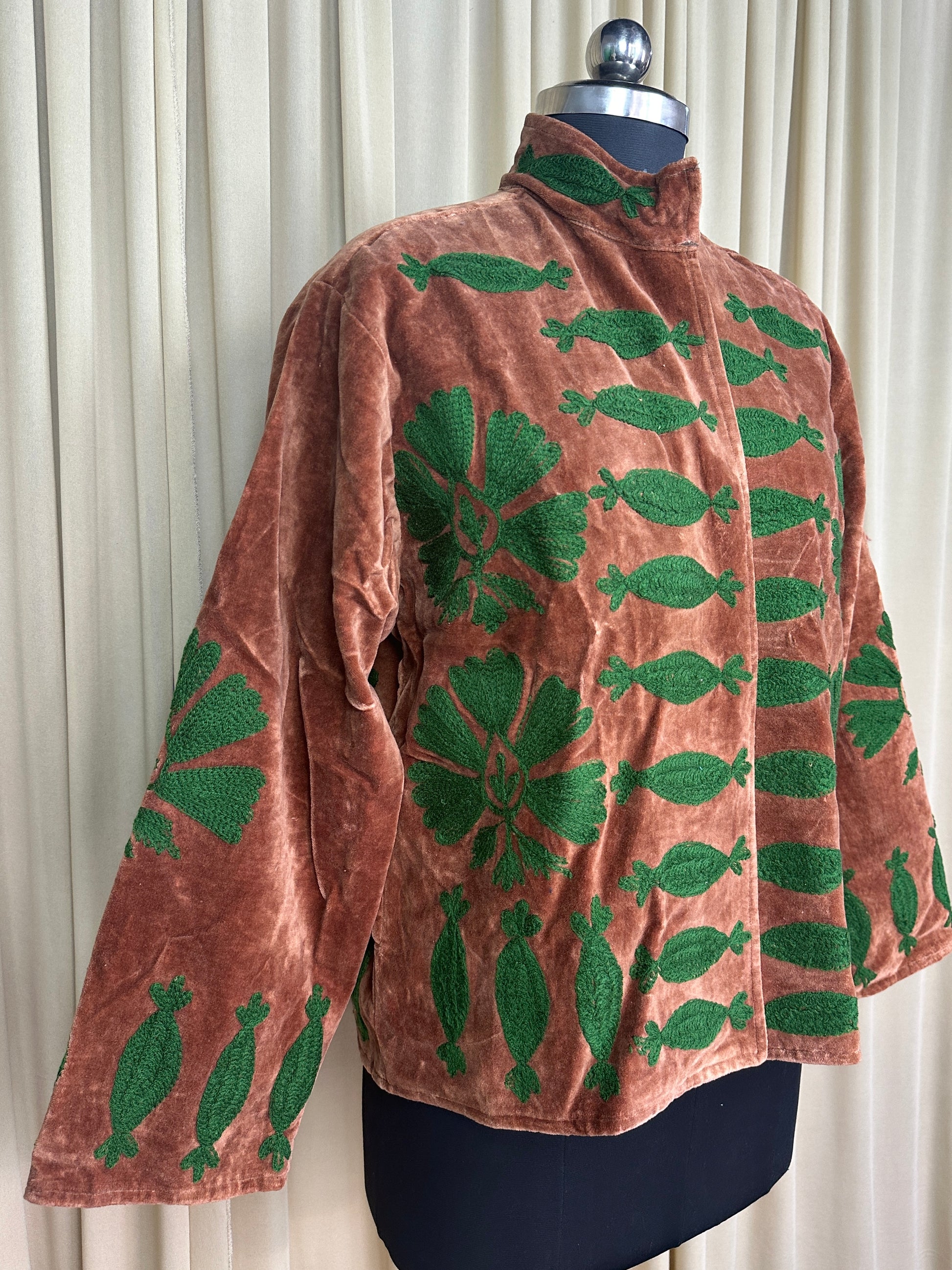 Wrap yourself in timeless artistry with this handcrafted Hand Embroidered Velvet Suzani Jacket, a stunning blend of boho charm and royal elegance. Each piece is meticulously embroidered by skilled artisans, creating a one-of-a-kind floral pattern that transforms this jacket into wearable art. The rich green velvet adds depth, luxury, and a soft drape, making it perfect for elevating everyday outfits or adding statement style to special occasions.