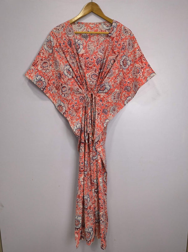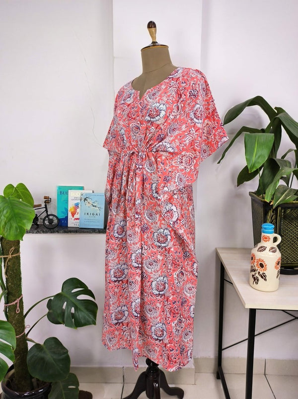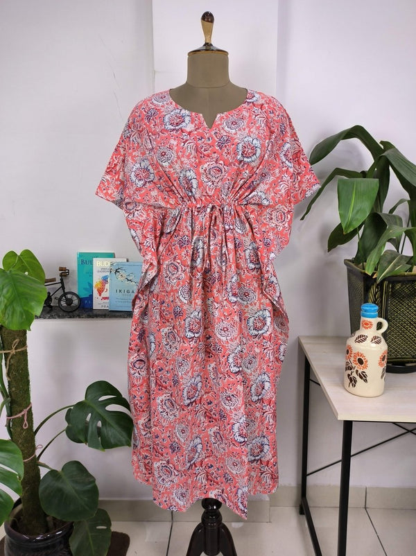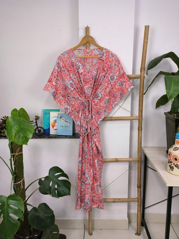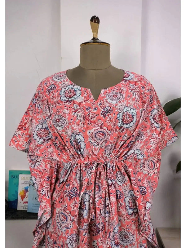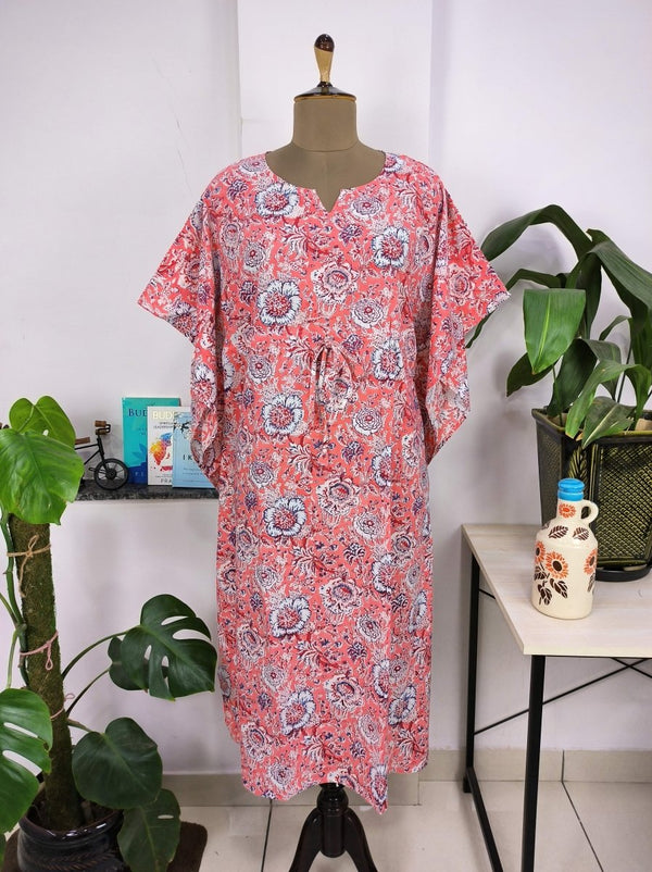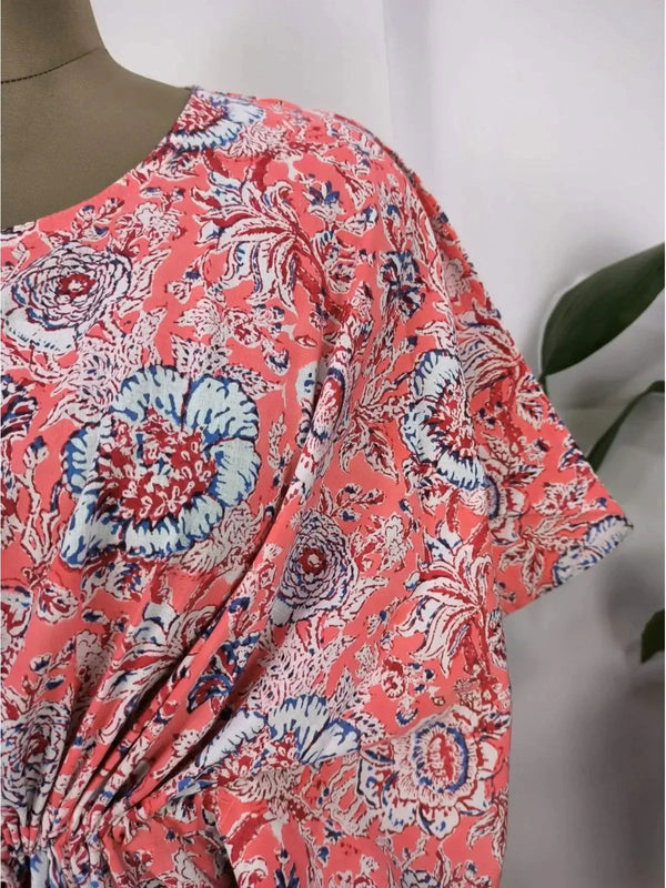 Robe Kaftan de style Boho | Indien imprimé à la main avec Mandy Pink Botanical | Tissu en coton léger et respirant, look d'été confortable et chic.