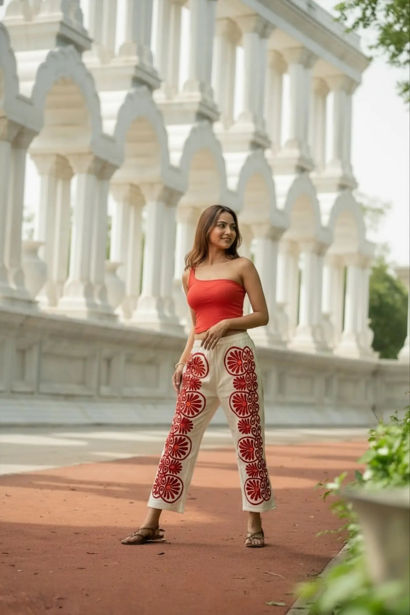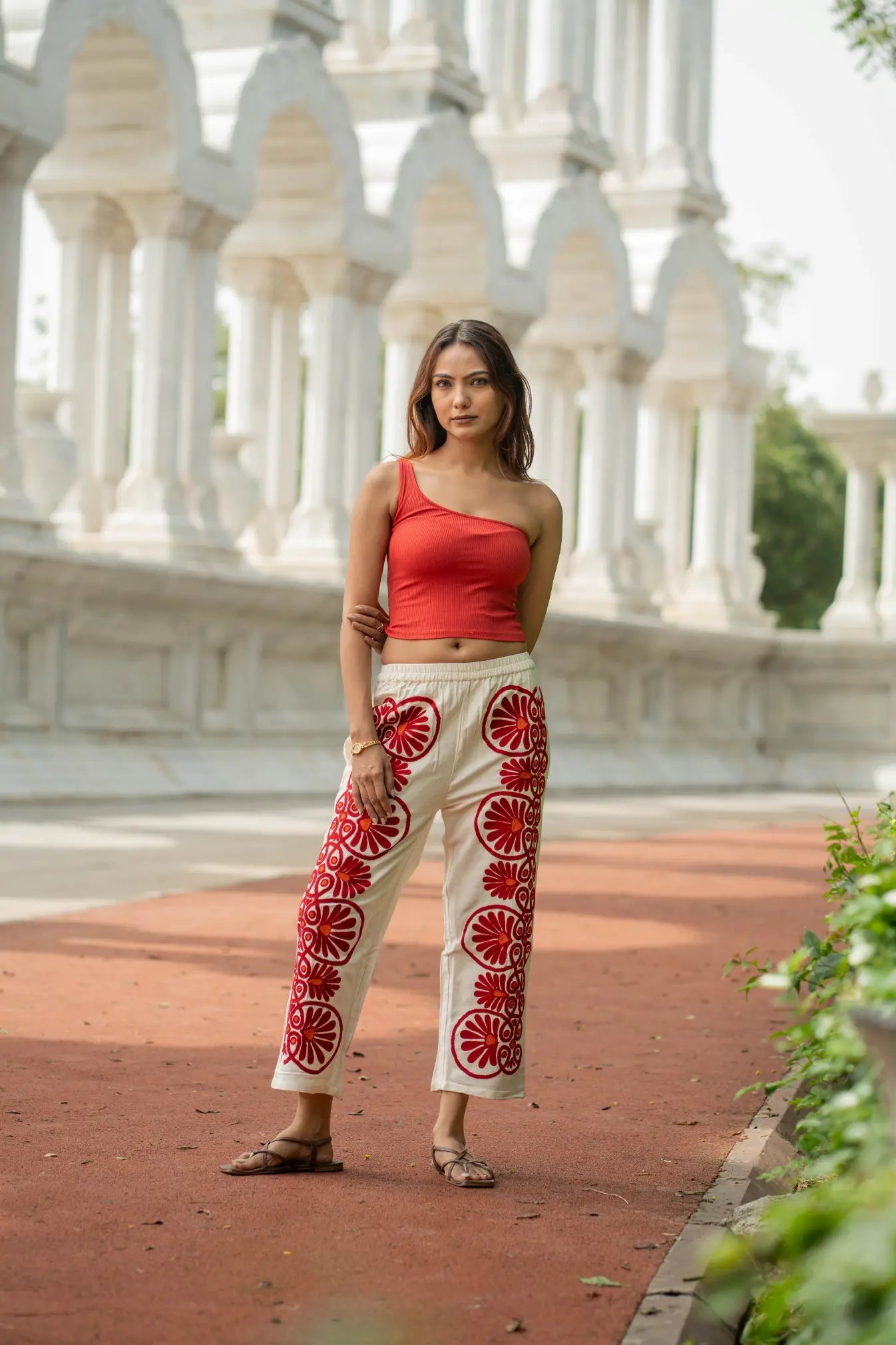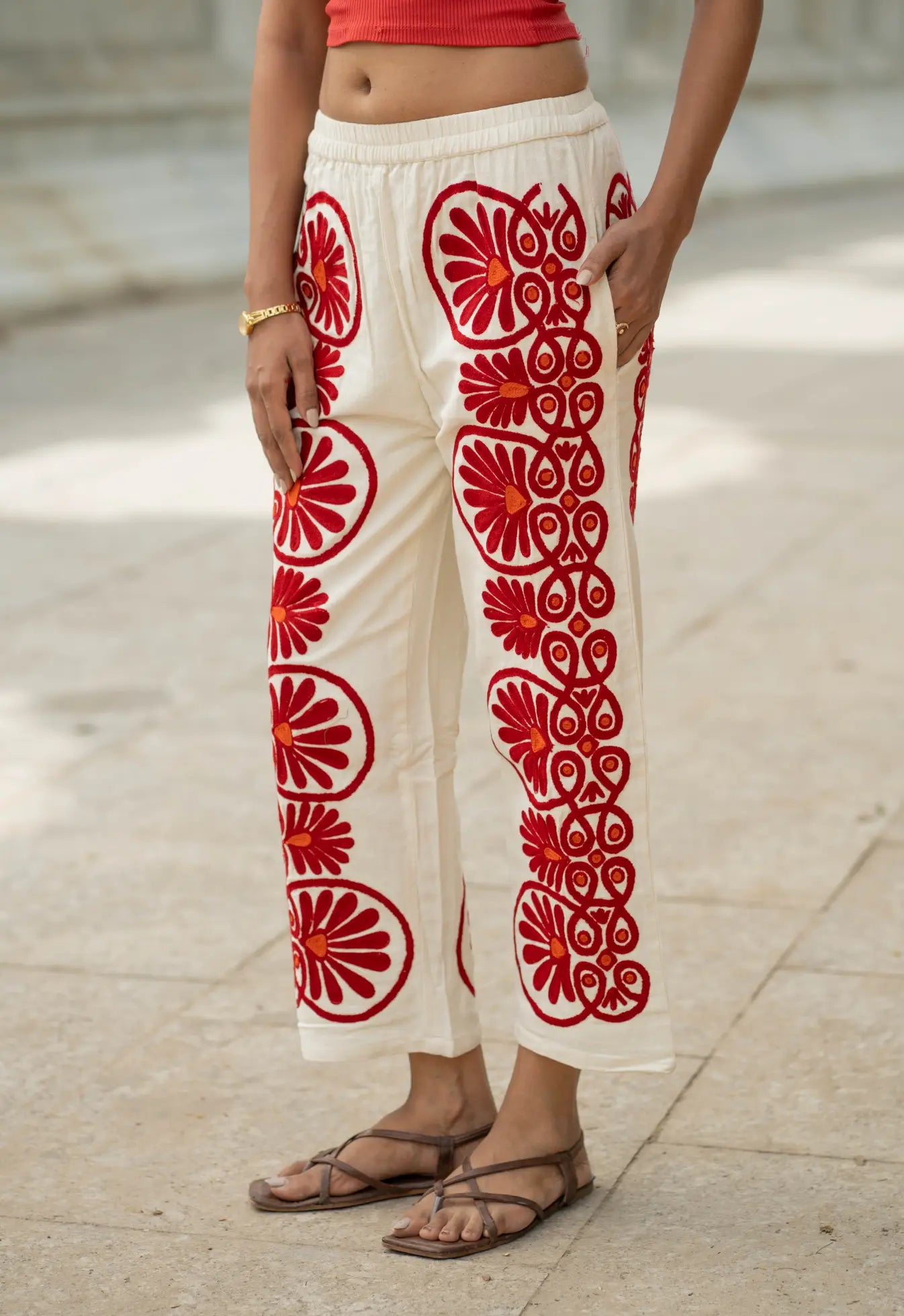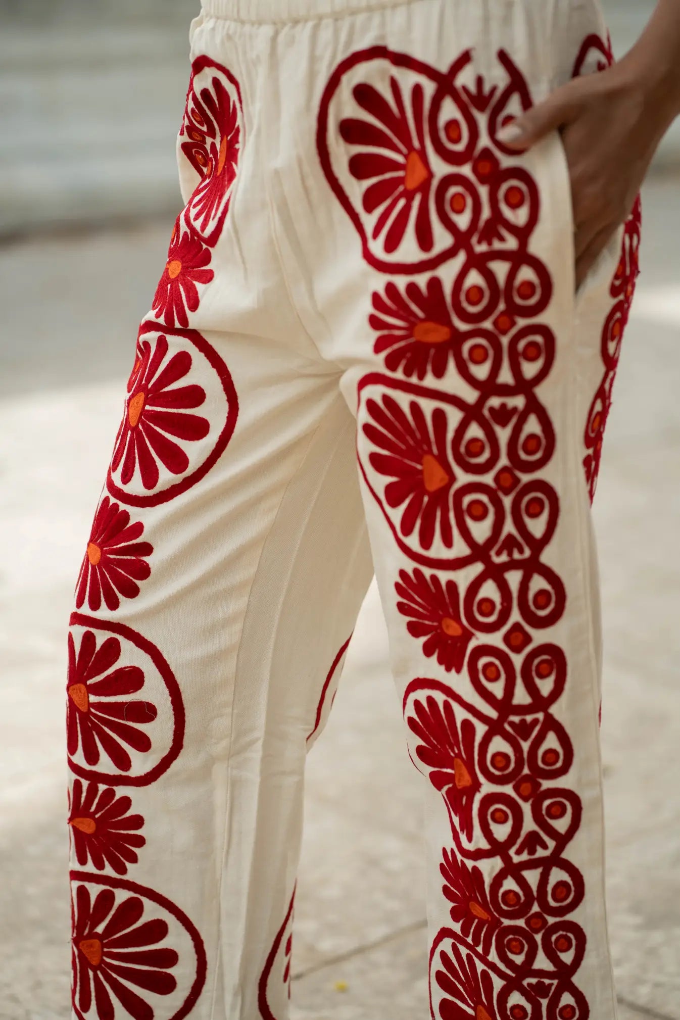 Artisan Craftsmanship: Each pant is meticulously hand-embroidered using the traditional Suzani technique, where every motif is stitched by hand with care and precision. The result is a one-of-a-kind piece that celebrates India’s rich textile artistry.