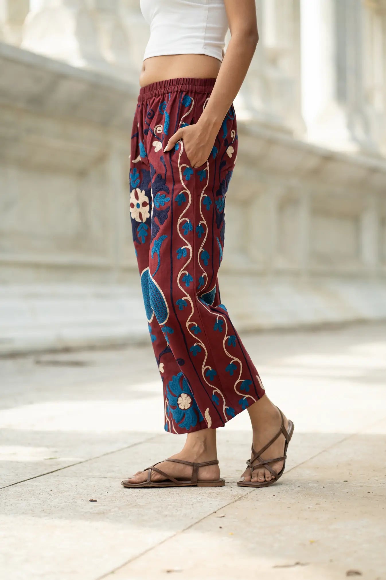 Artisan Craftsmanship: Each pant is meticulously hand-embroidered using the traditional Suzani technique, where every motif is stitched by hand with care and precision. The result is a one-of-a-kind piece that celebrates India’s rich textile artistry.