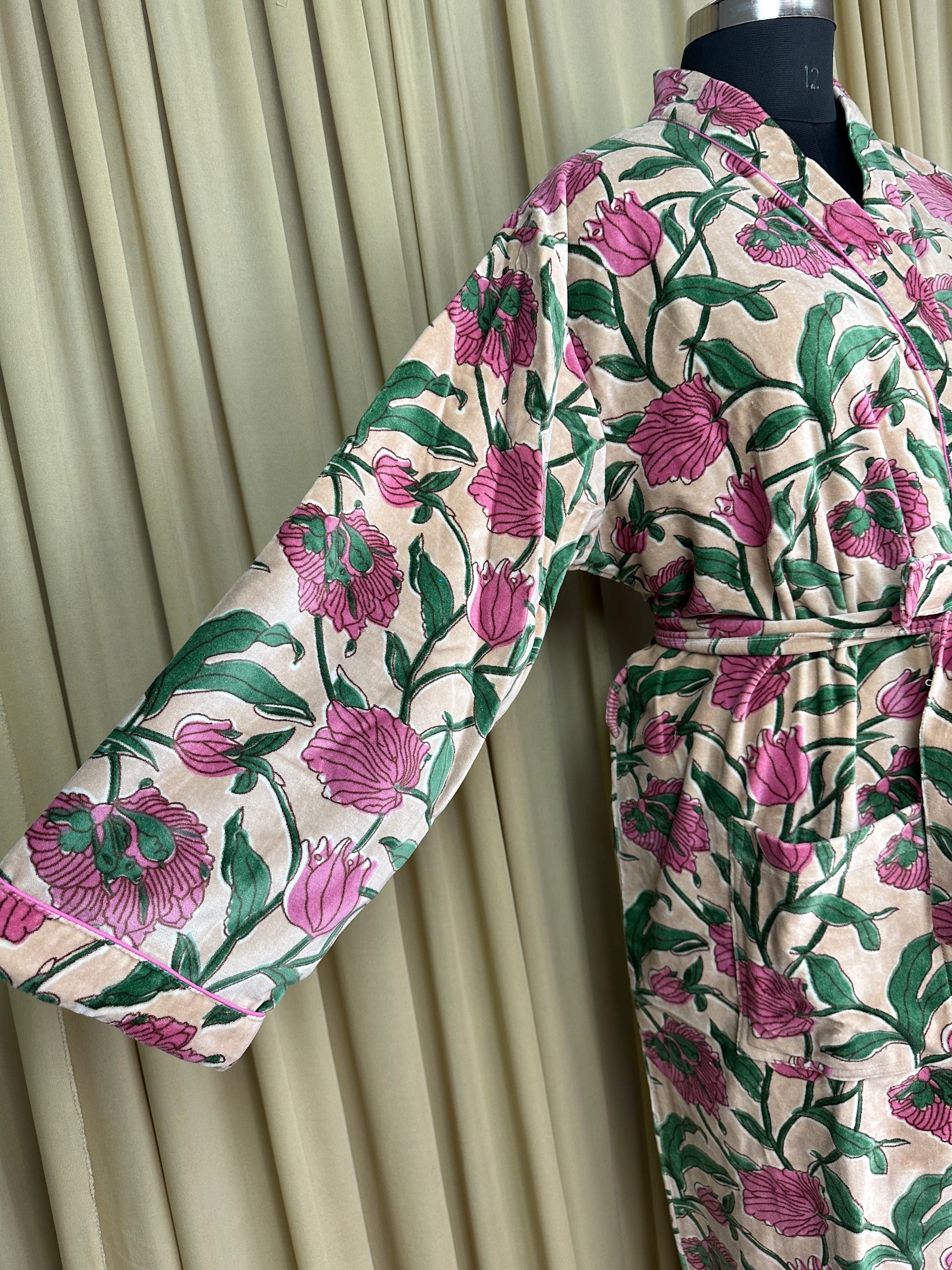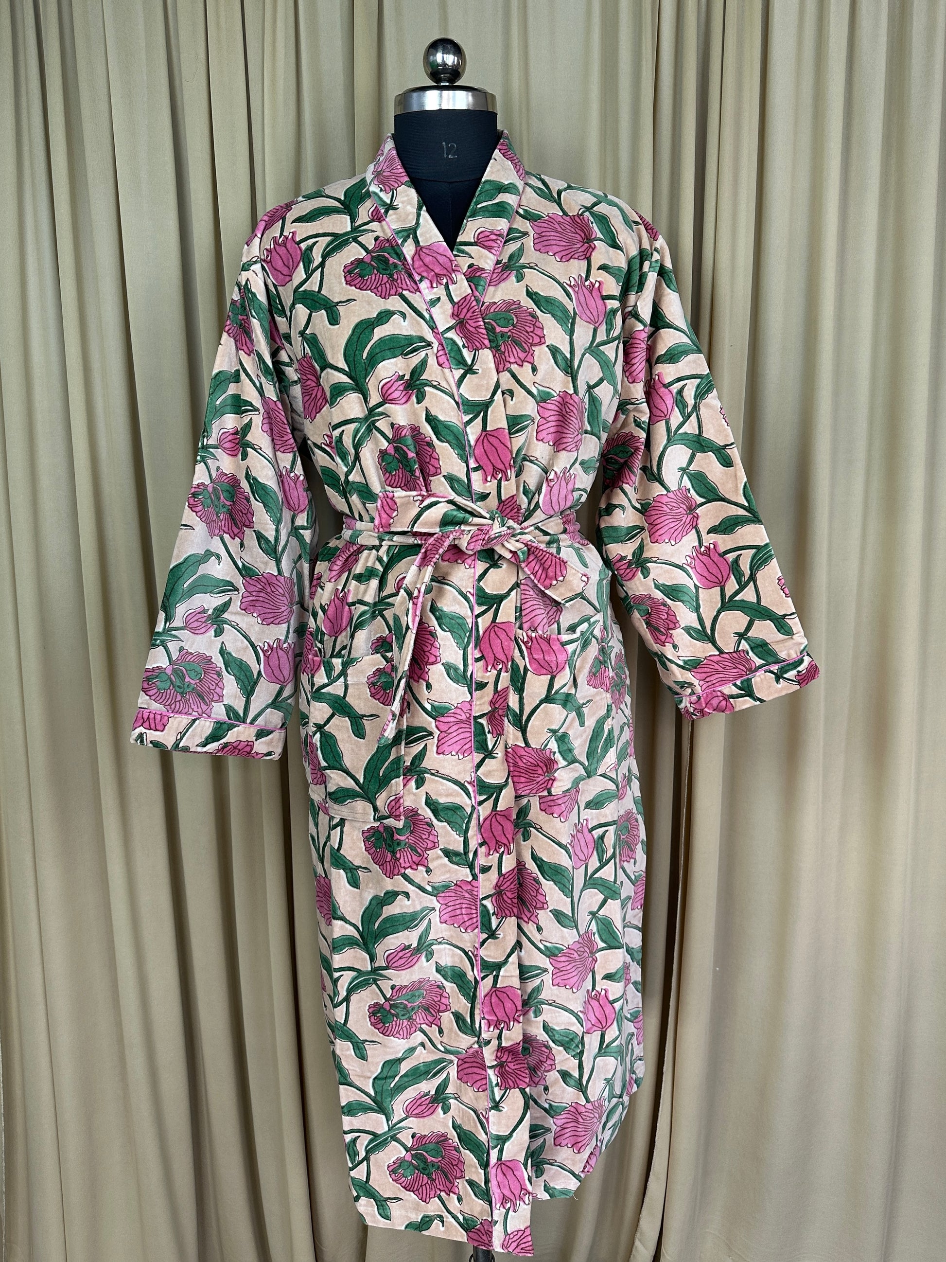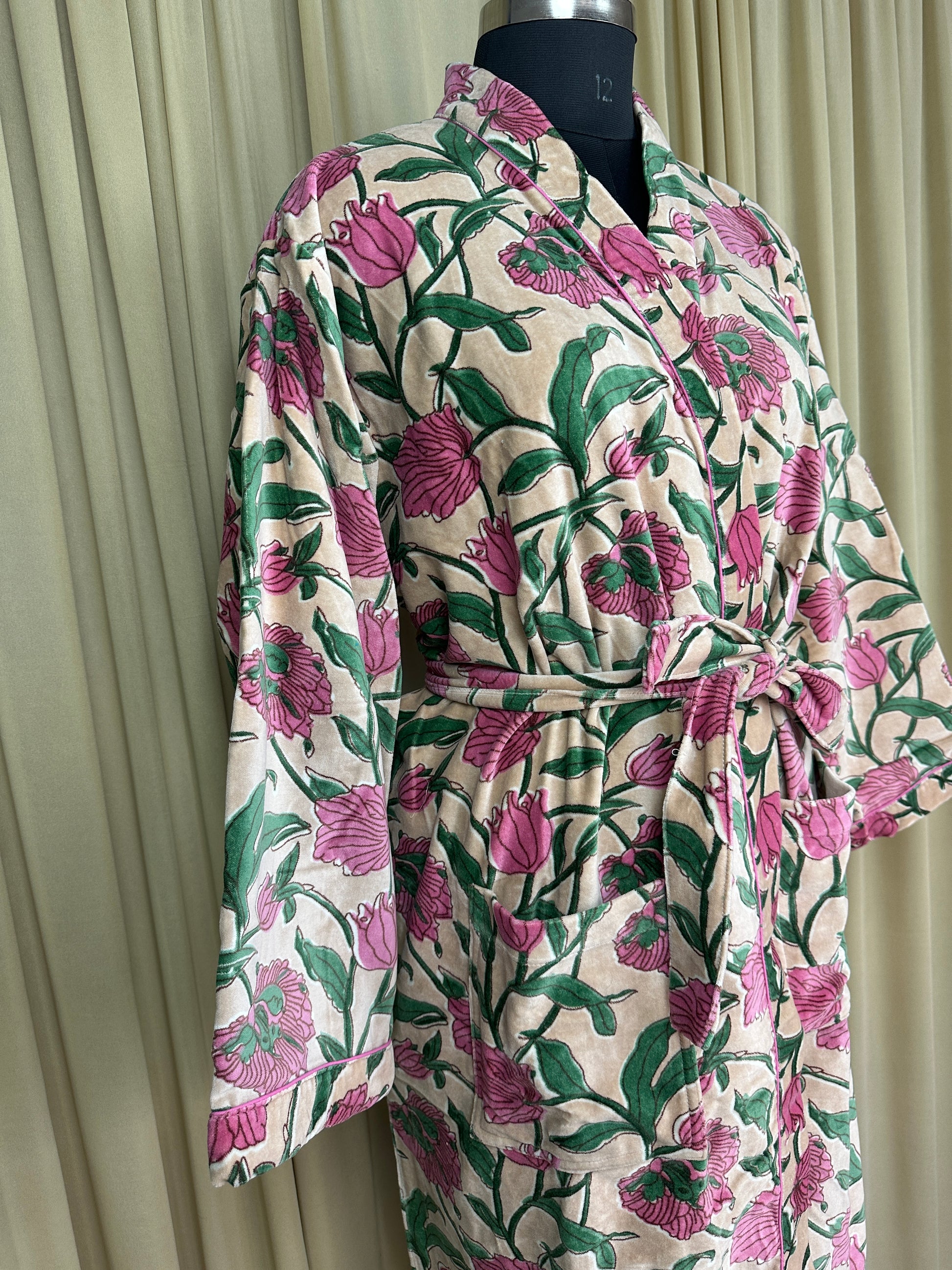 Luxury Velvet Kimono Unisex House Robe | Boho Jacket Autumn Winter Christmas Gift Elegant Reversible Silk Lined | Quirky Gown Beige Floral
