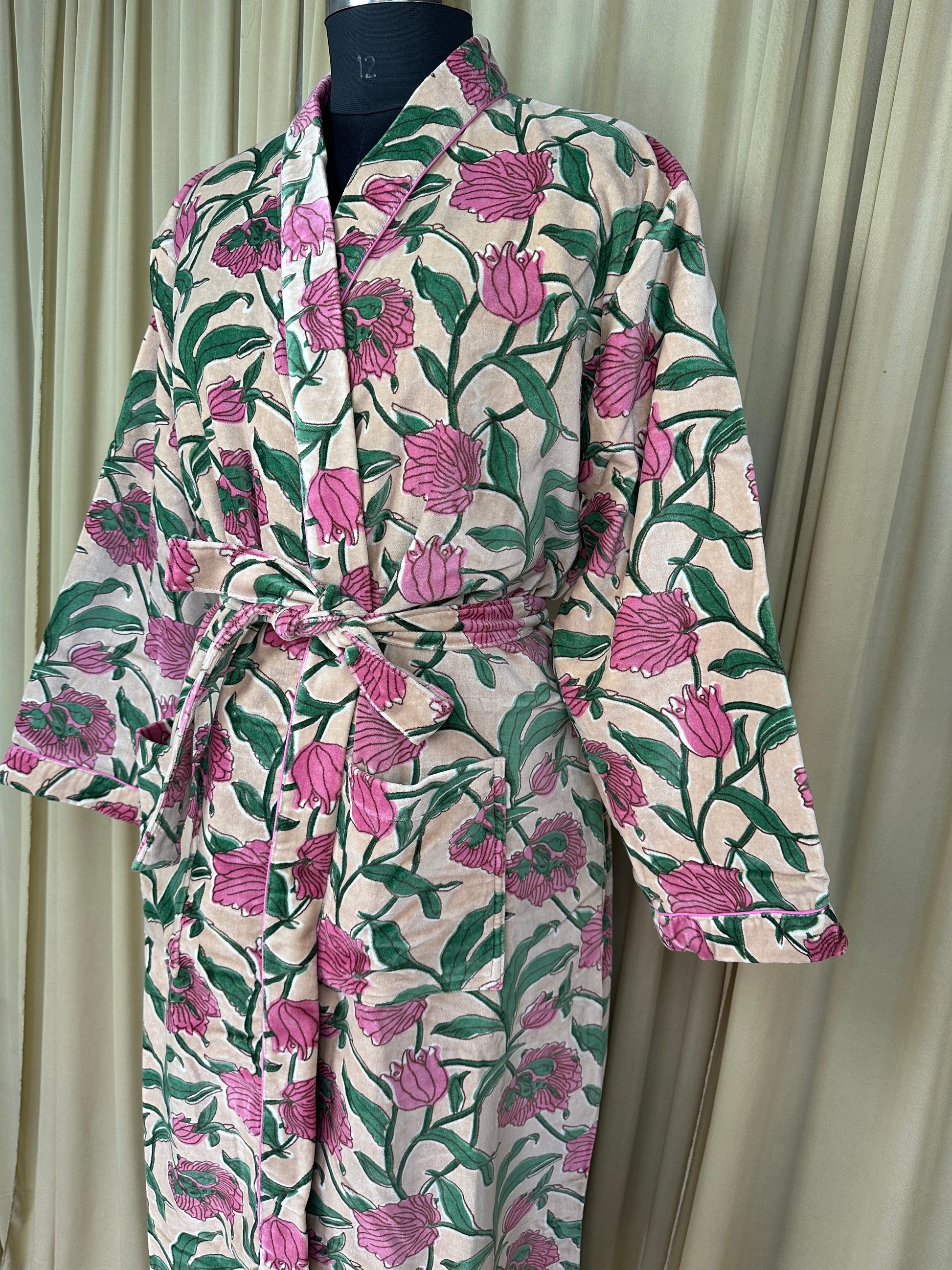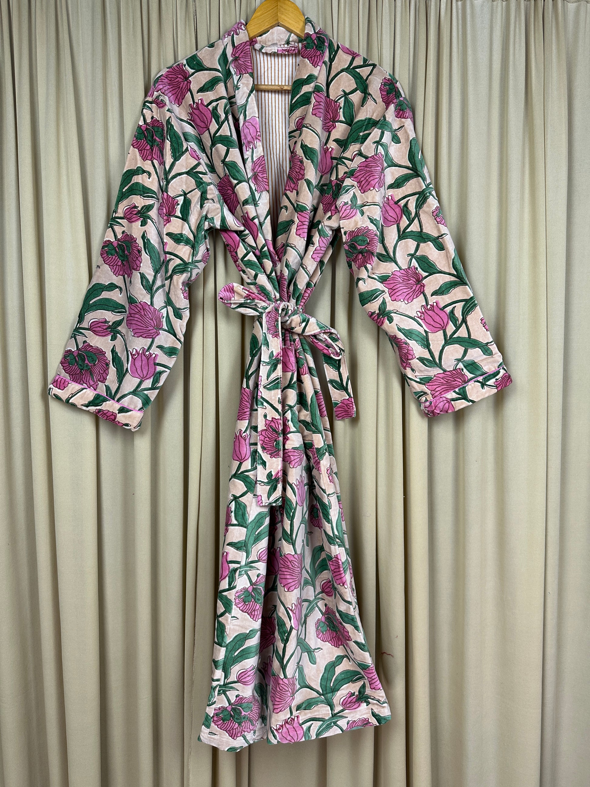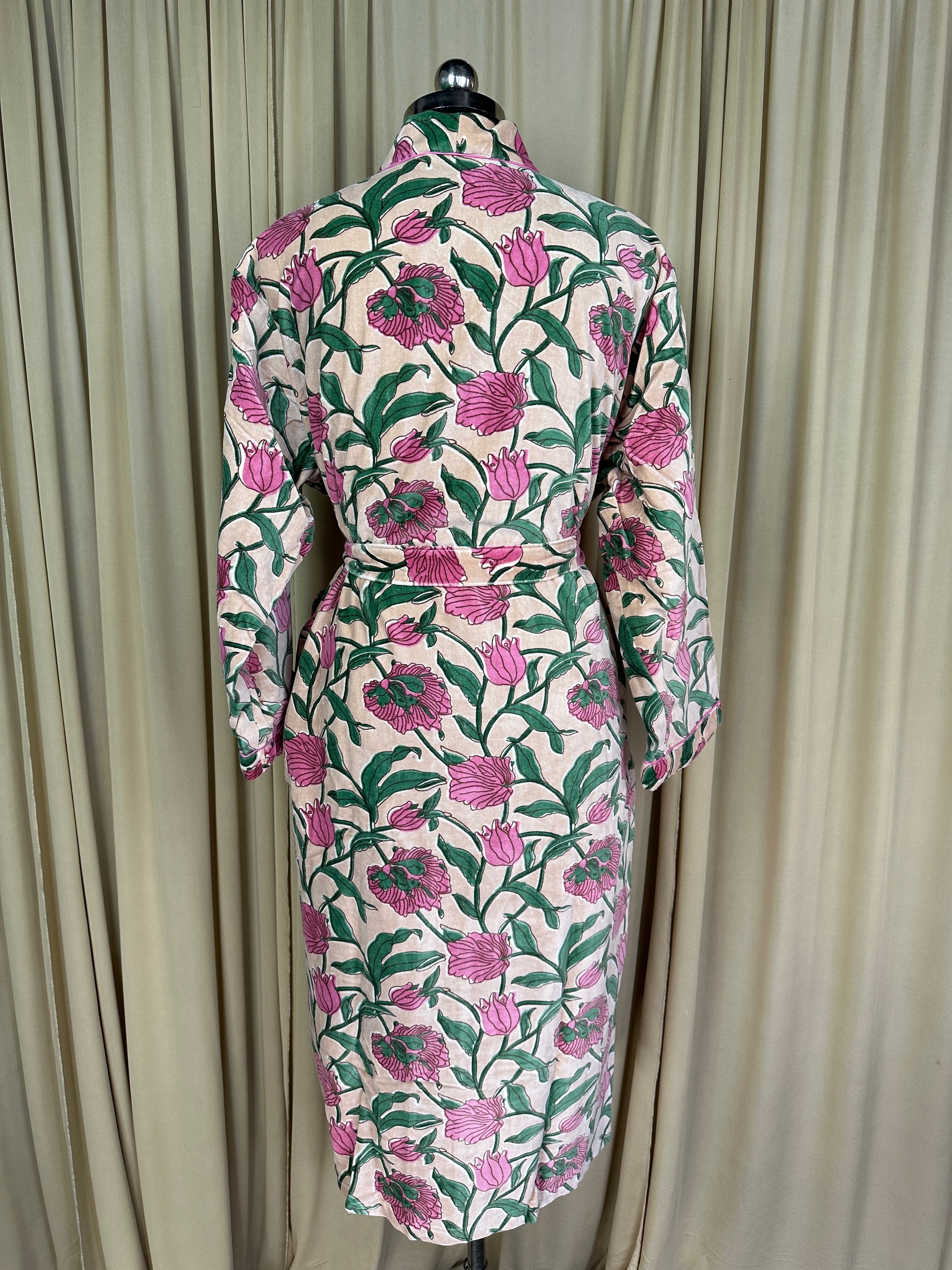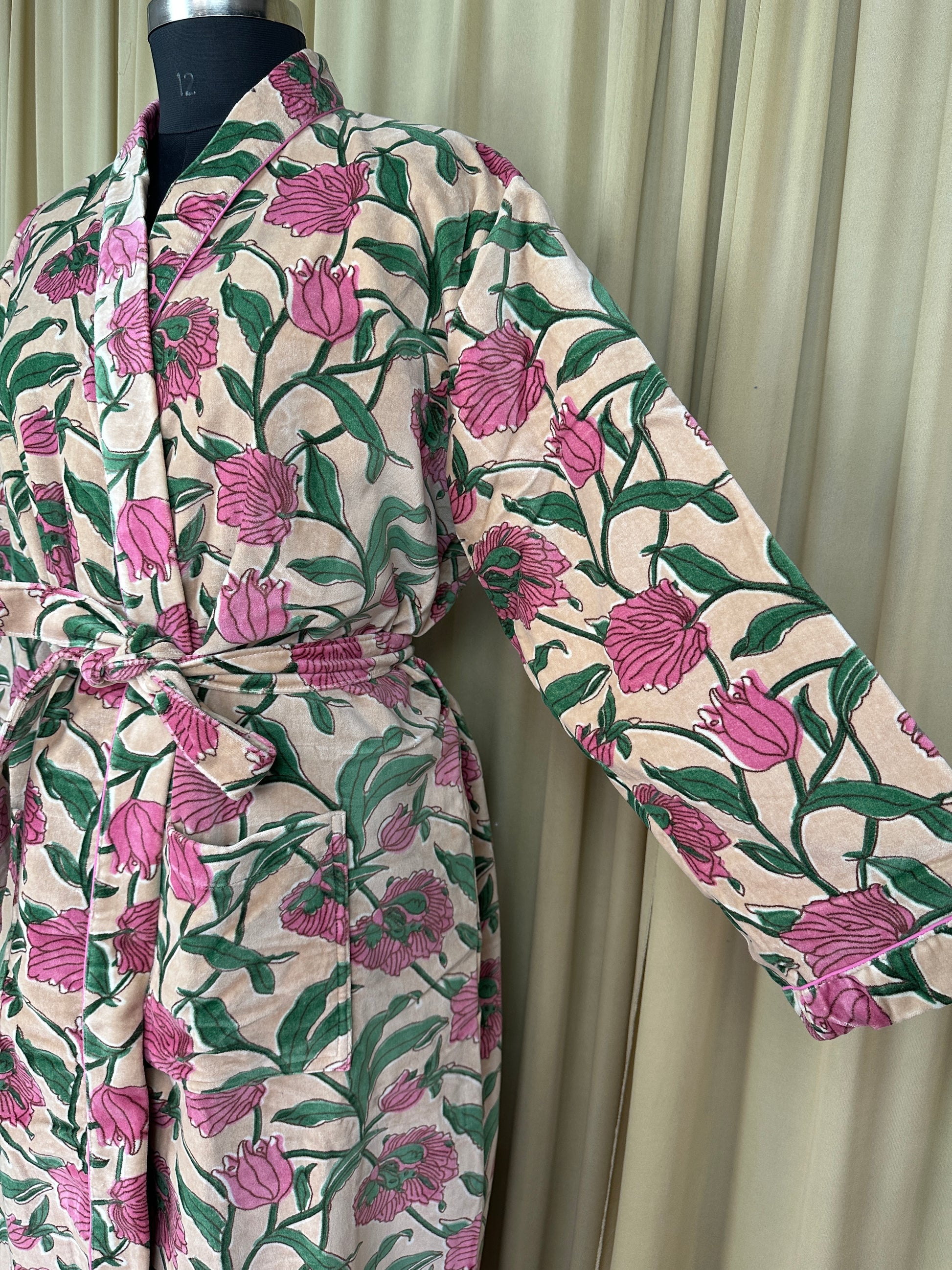 Luxury Velvet Kimono Unisex House Robe | Boho Jacket Autumn Winter Christmas Gift Elegant Reversible Silk Lined | Quirky Gown Beige Floral