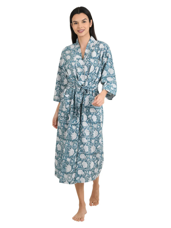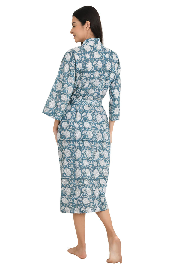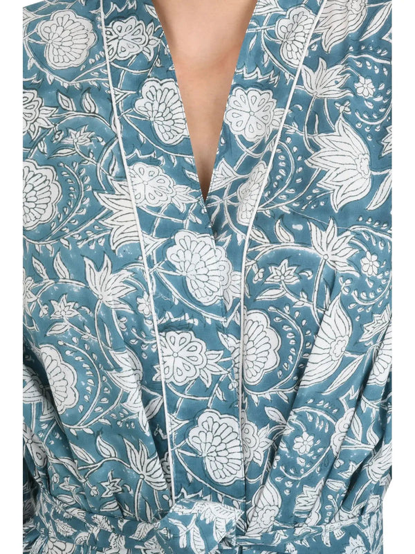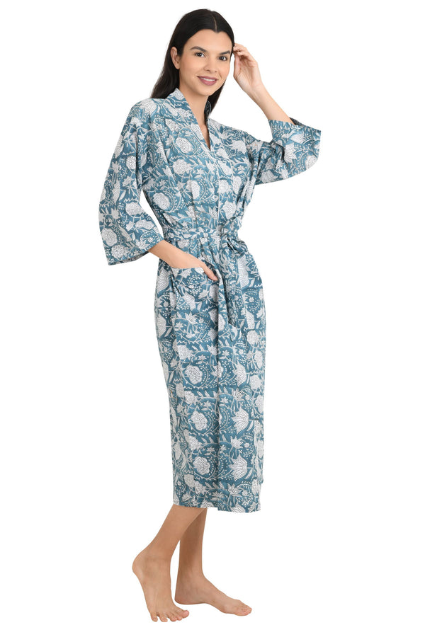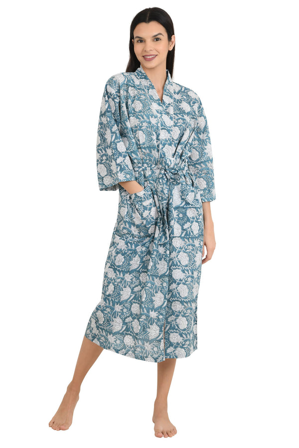 Pur coton Kimono indien imprimé à la main Boho House Robe Robe d’été | Imprimé floral blanc gris | Vêtements de couverture de plage | Cadeau de Noël