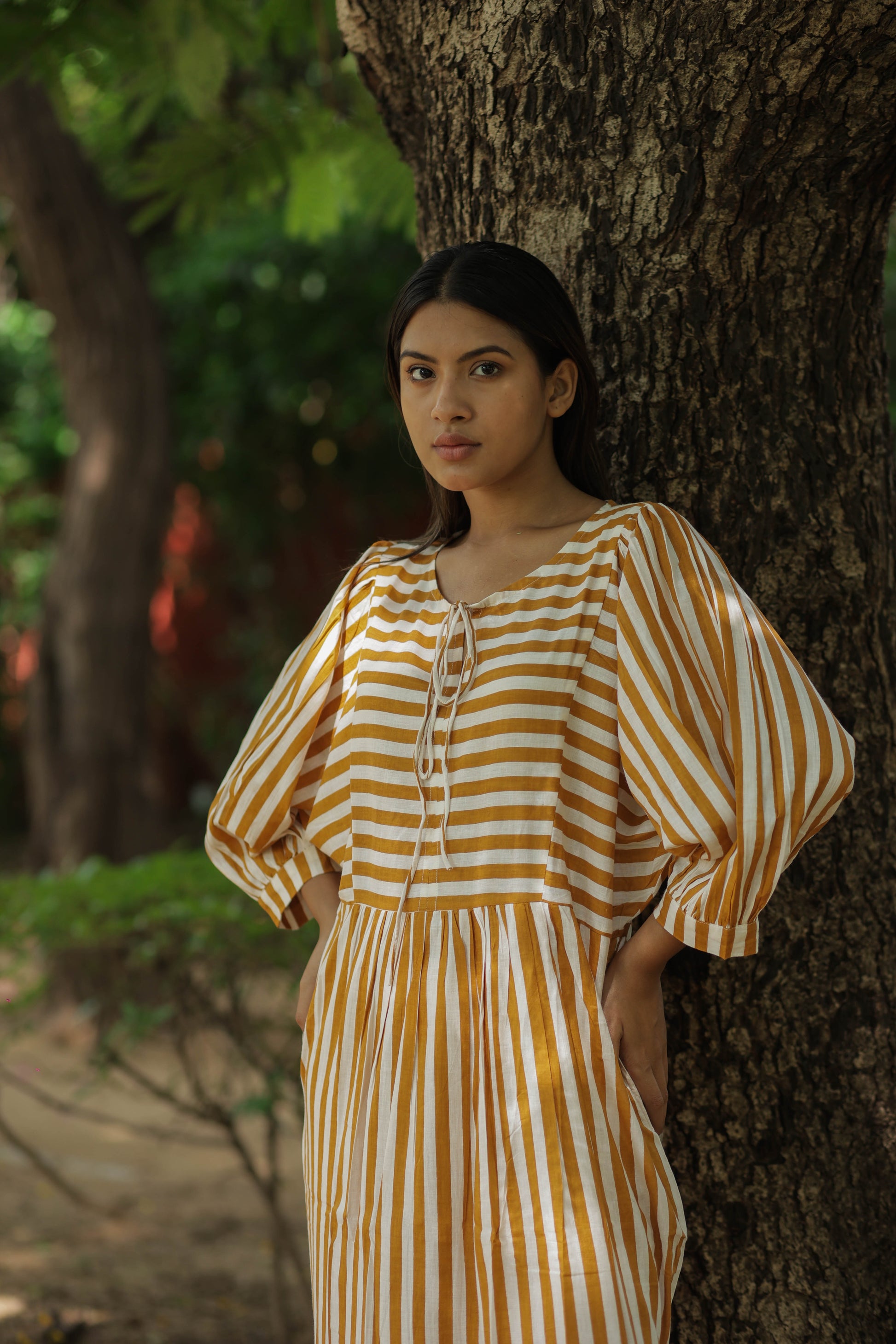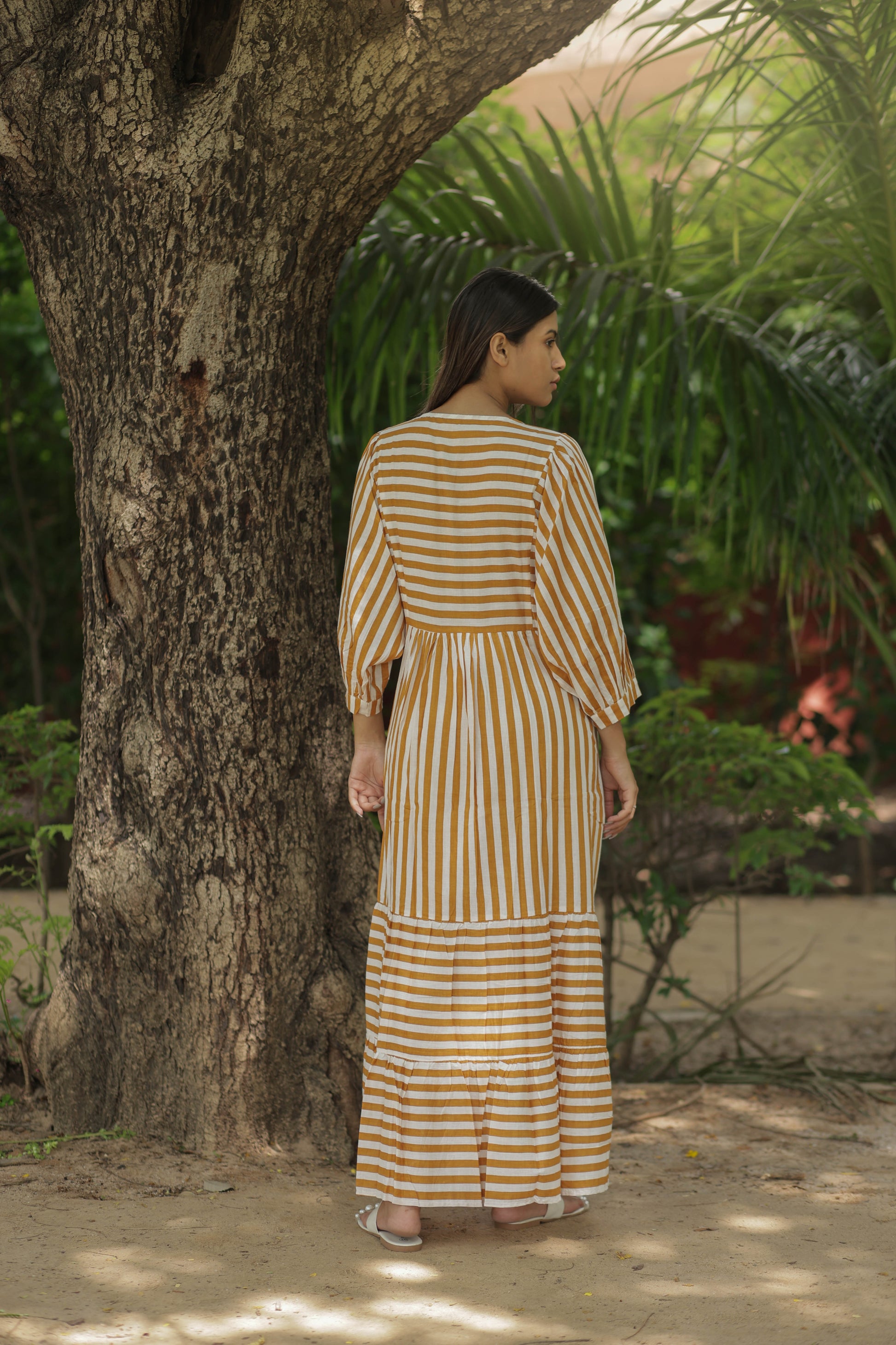 Experience timeless elegance and comfort with our Women Cotton Maxi Dress from The Eastern Loom. Expertly crafted from 100% organic cotton, this long, flowy gown is designed for women and girls who appreciate sustainable fashion, breathable comfort, and versatile style. Featuring a hand block printed striped pattern in a rich brown hue, this dress is both unique and eco-friendly, making it a standout addition to any wardrobe.