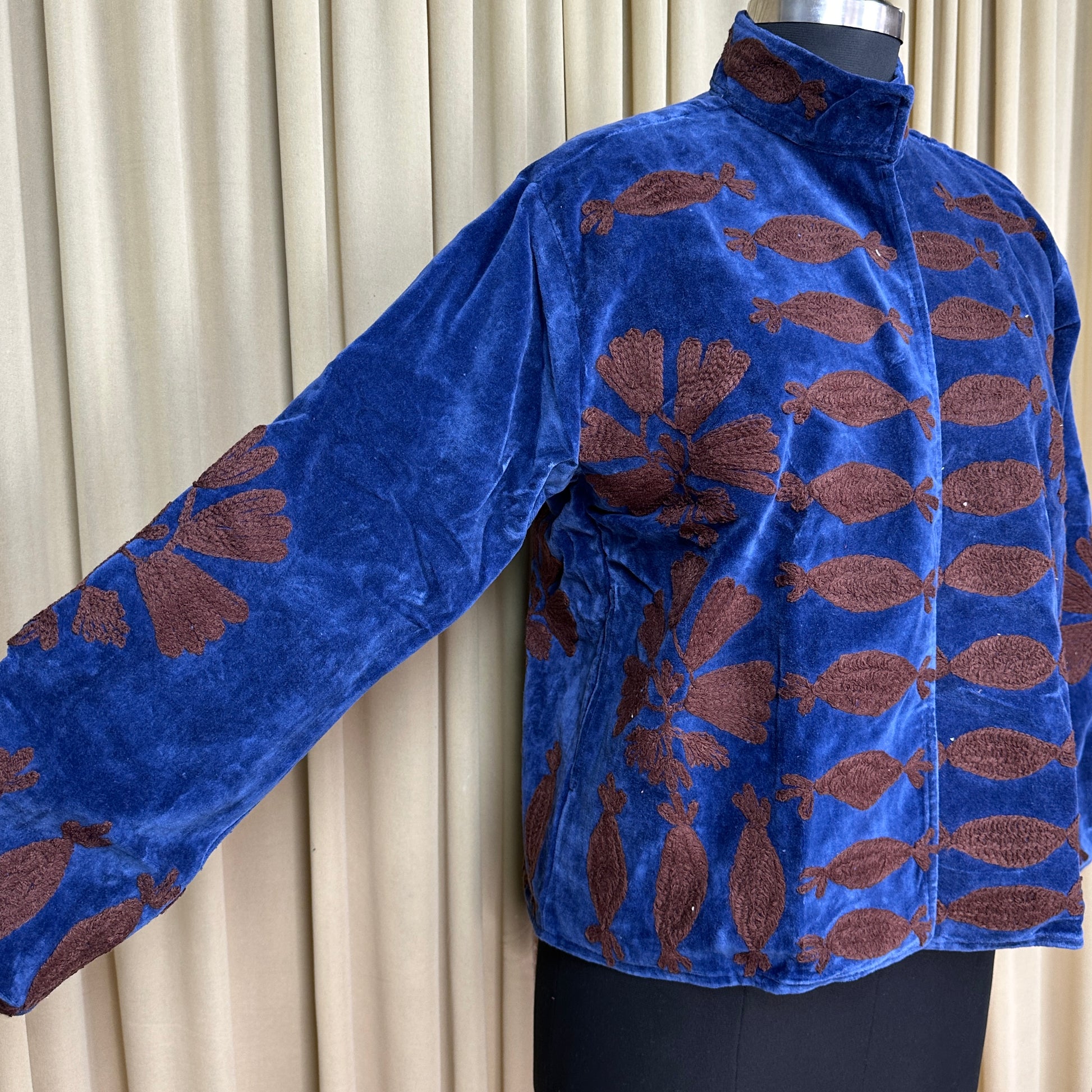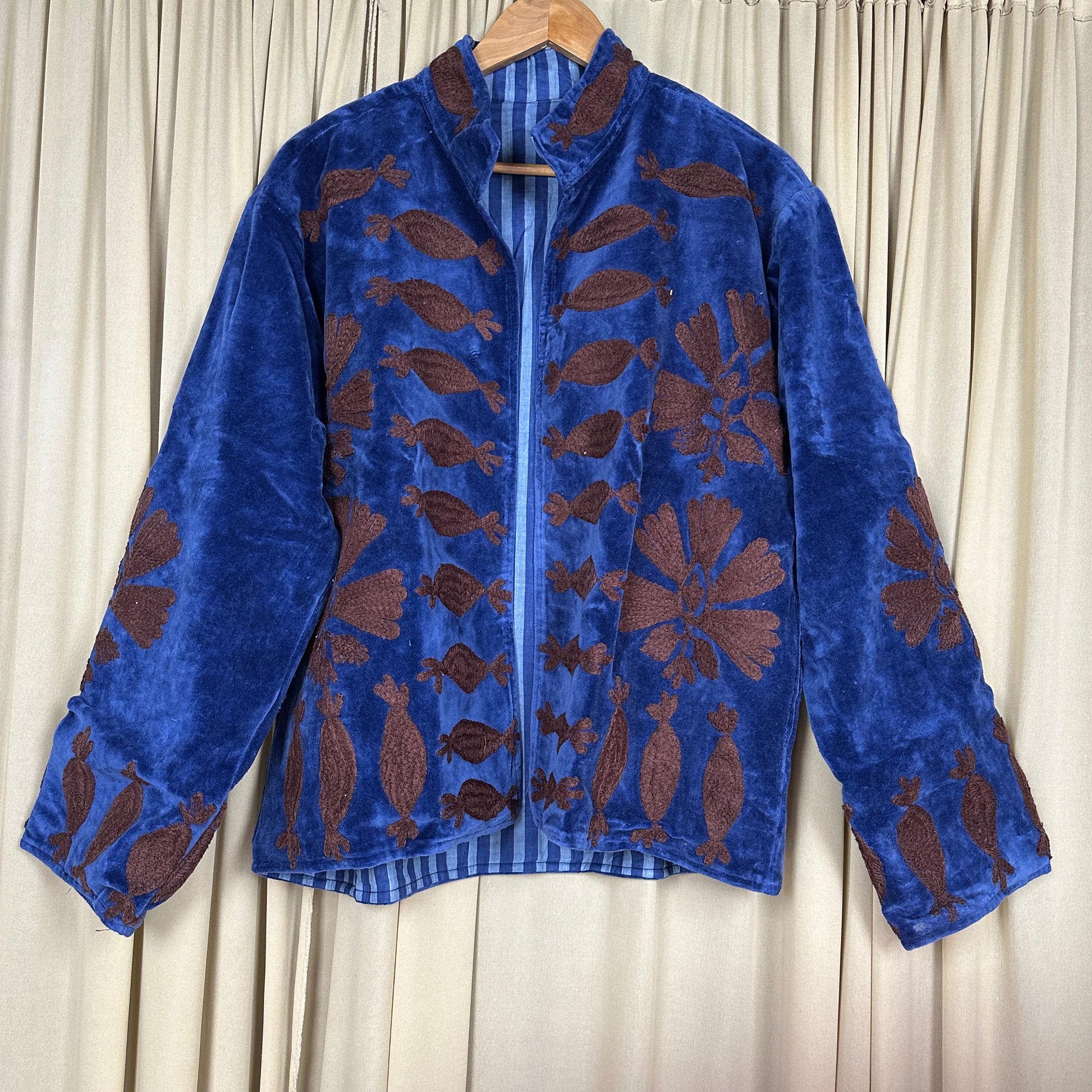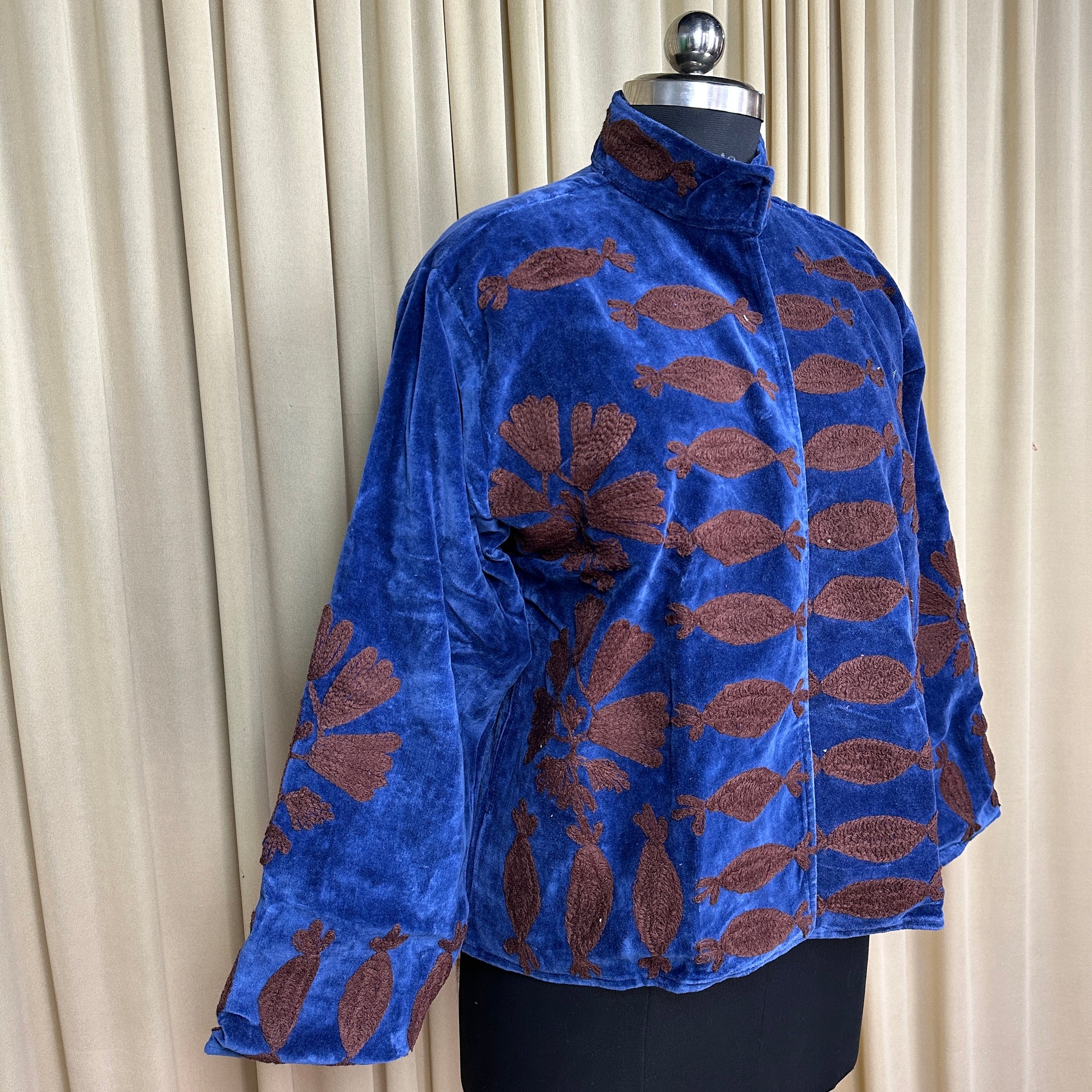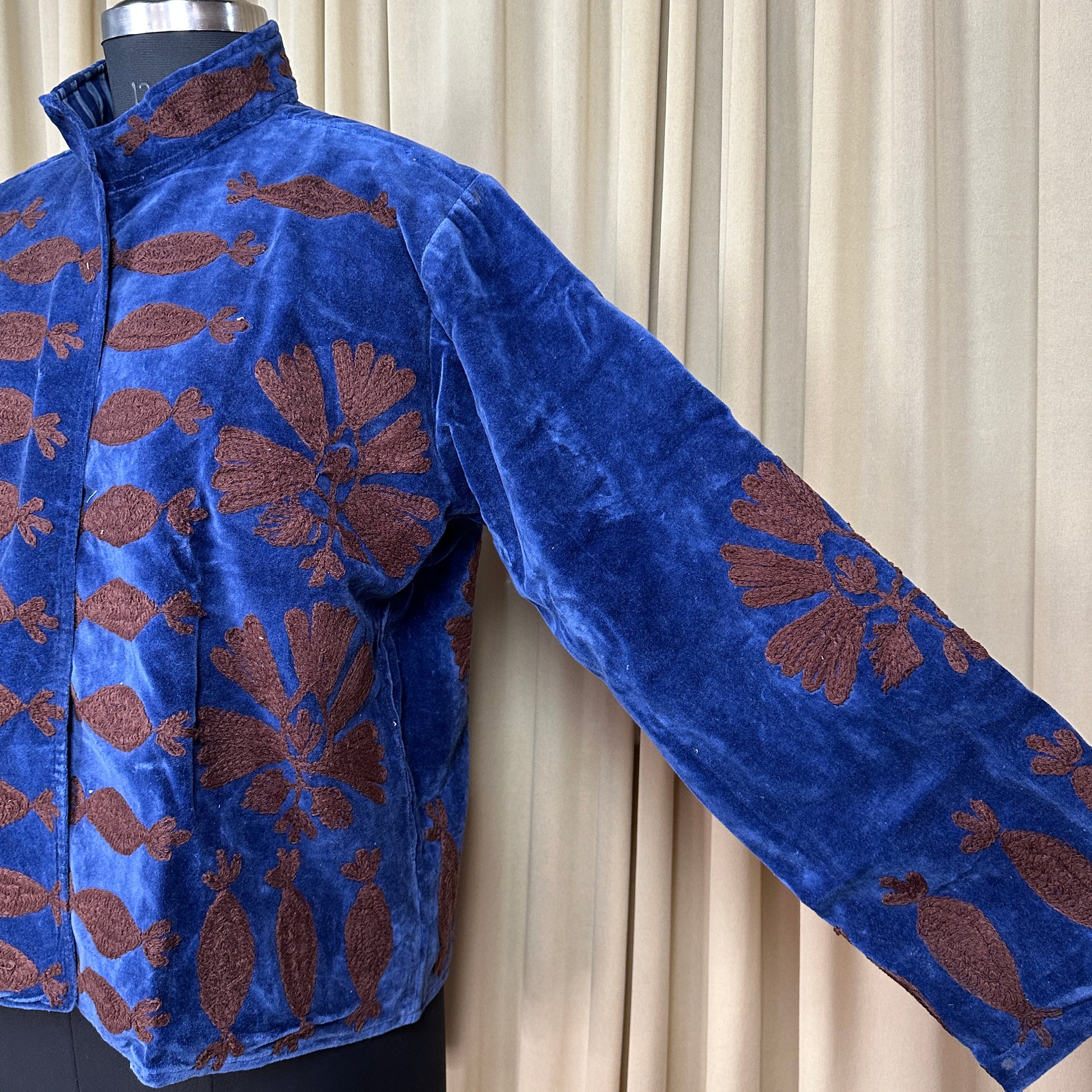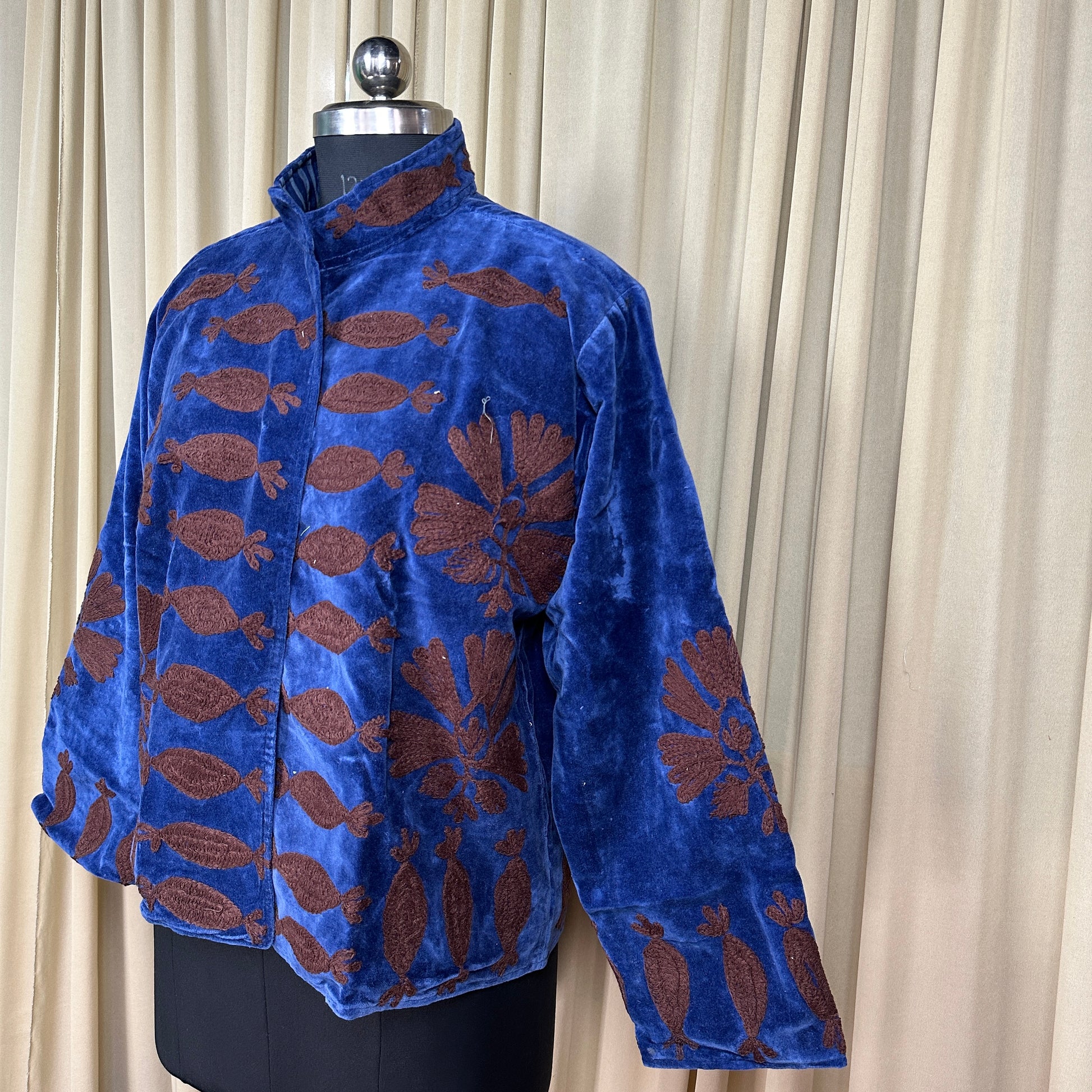 Wrap yourself in timeless artistry with this handcrafted Hand Embroidered Velvet Suzani Jacket, a stunning blend of boho charm and royal elegance. Each piece is meticulously embroidered by skilled artisans, creating a one-of-a-kind floral pattern that transforms this jacket into wearable art. The rich Blue velvet adds depth, luxury, and a soft drape, making it perfect for elevating everyday outfits or adding statement style to special occasions.