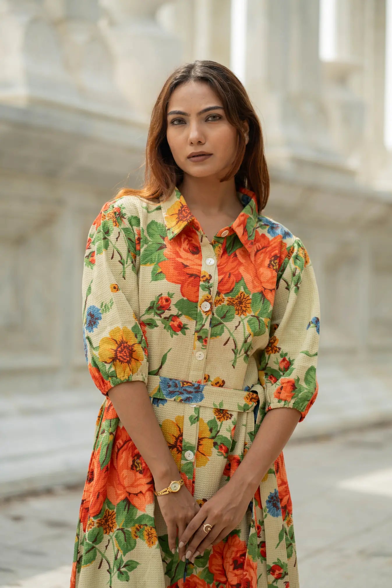 The design works beautifully as a cotton dress, summer dress, midi dress, mini dress, long dress, or relaxed summer tunic. Its soft color palette, earthy and colourful tones, and rose dream floral story give it an elegant yet comfy look suited for daywear, casual outings, and effortless bohemian wardrobes. Button closure detailing and functional side pockets enhance comfort and usability, while the handcrafted process reflects true ethical fashion values using friendly dyed fabric.