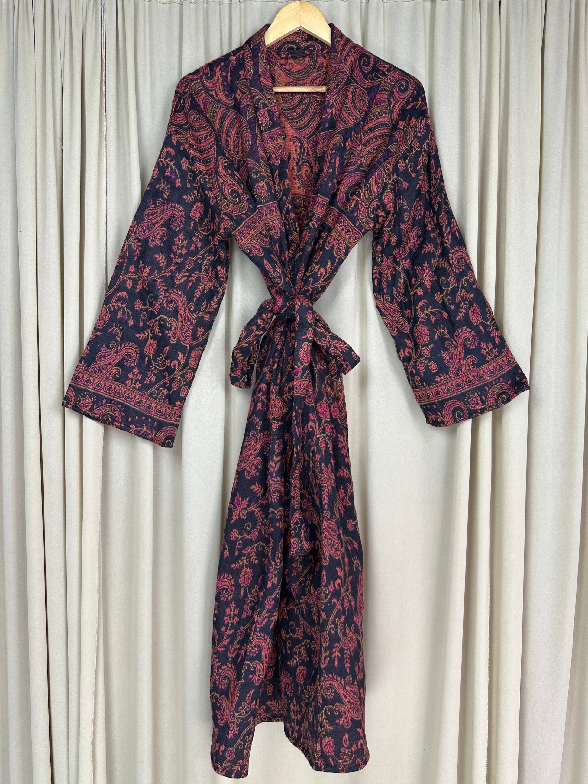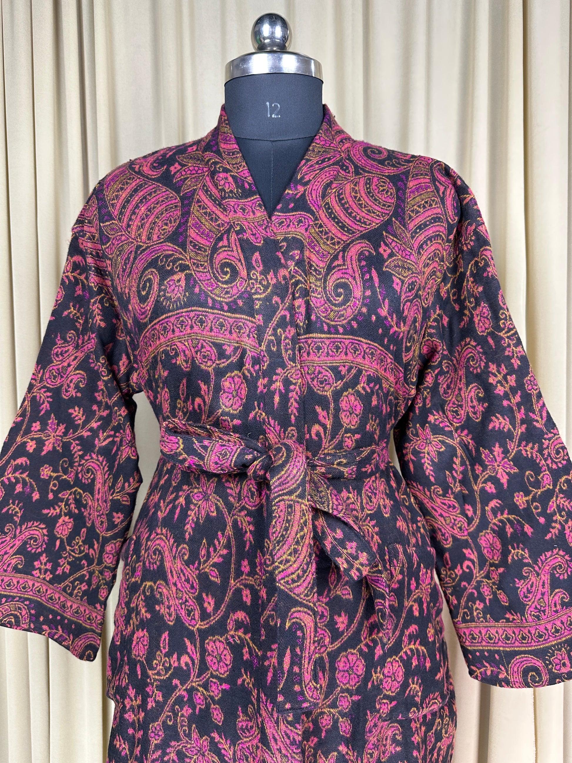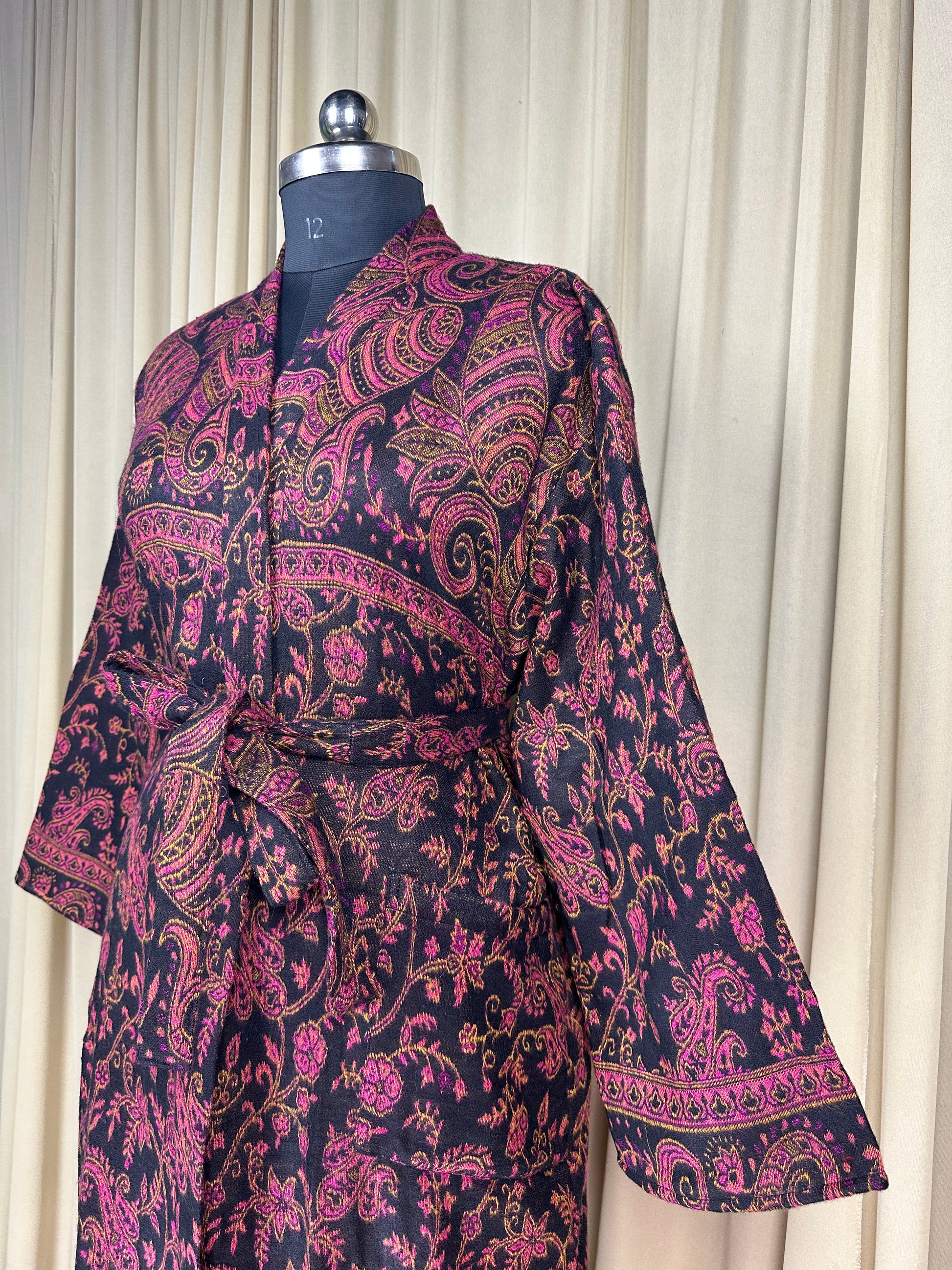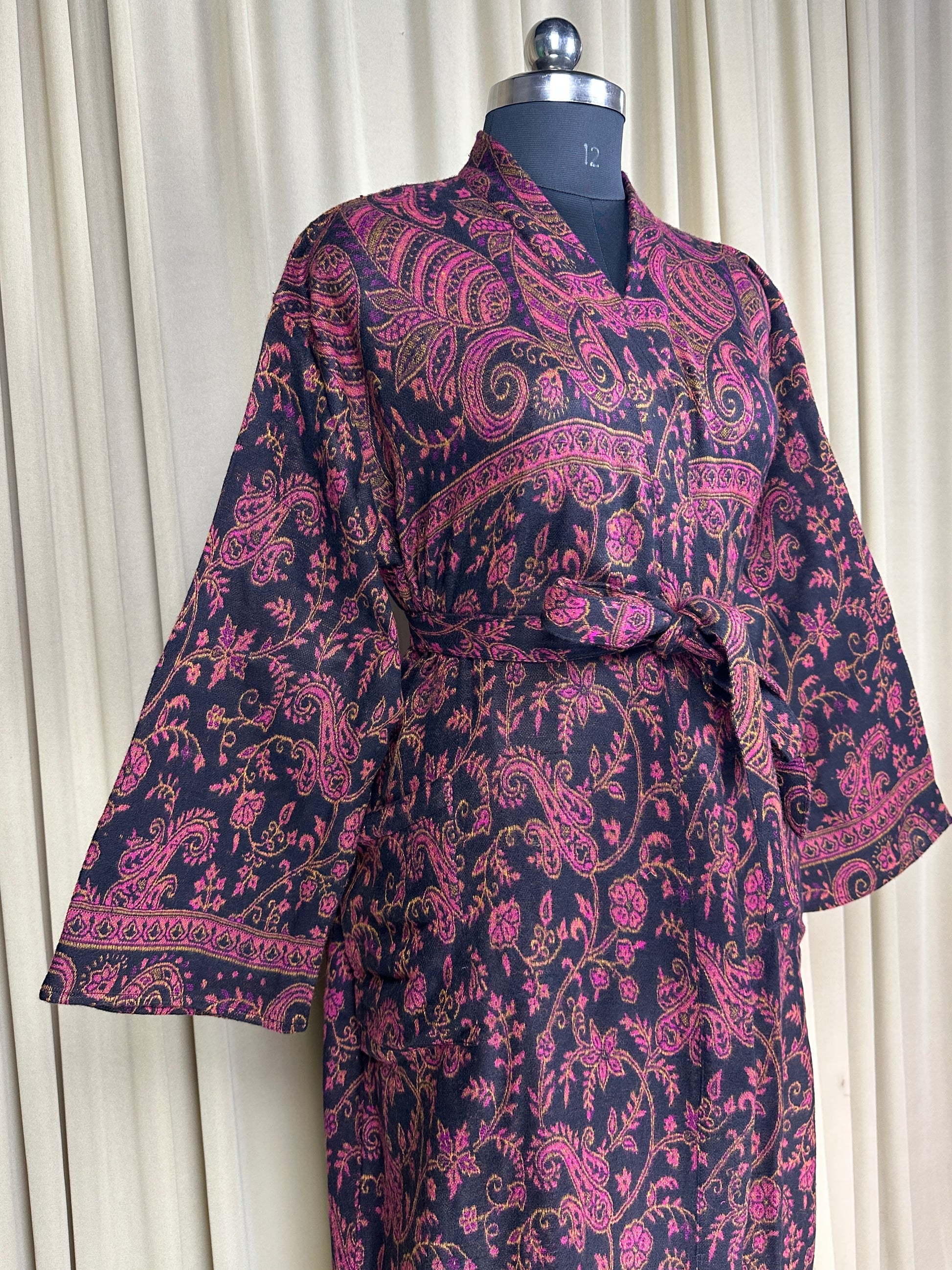 Yak Wool Blend Kimono Robe: Maroon Paisley Print, Warm Winter Wear