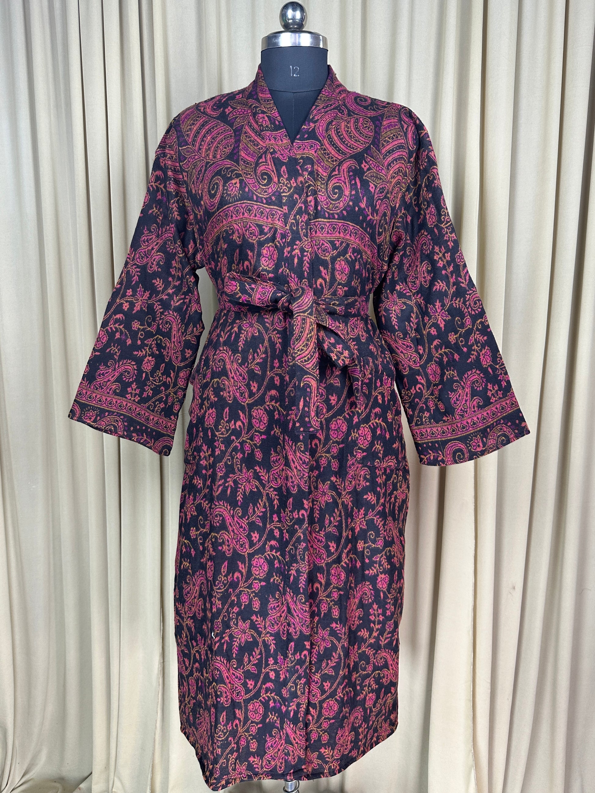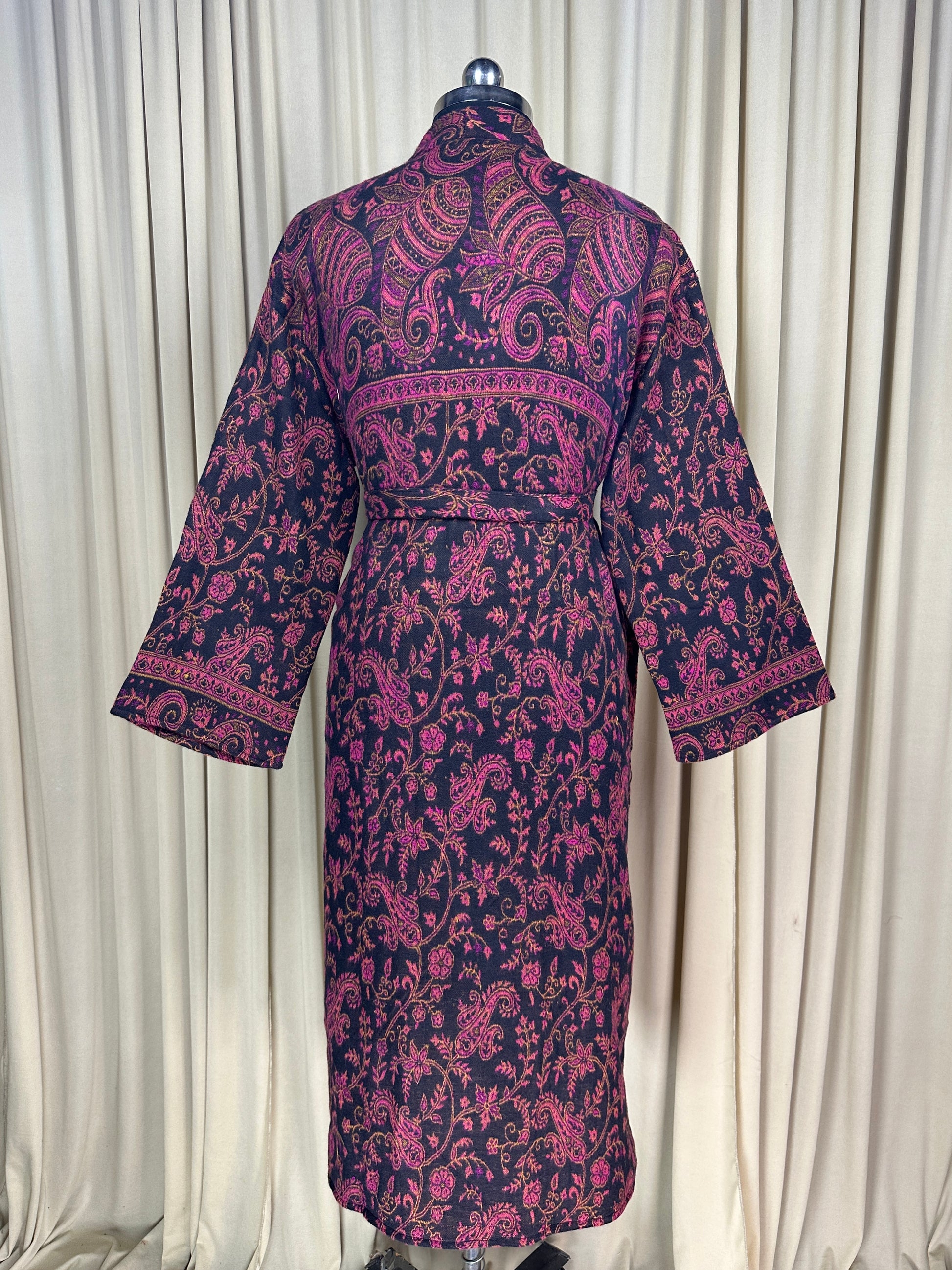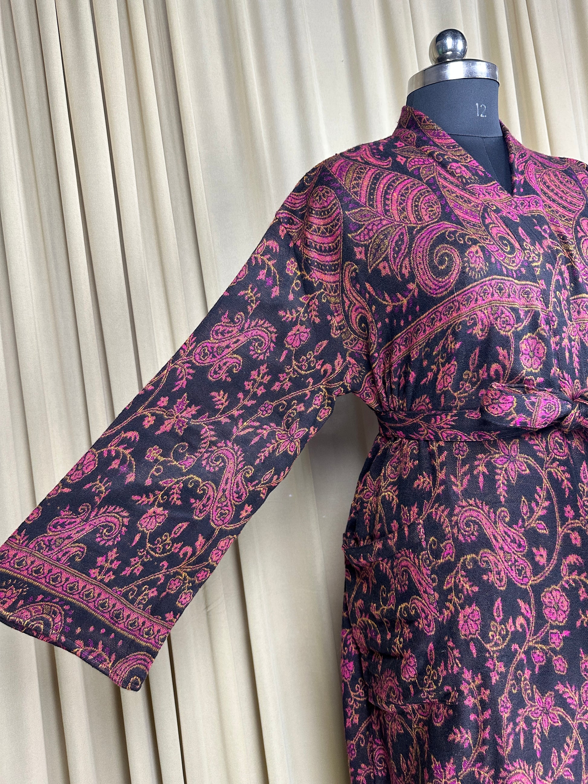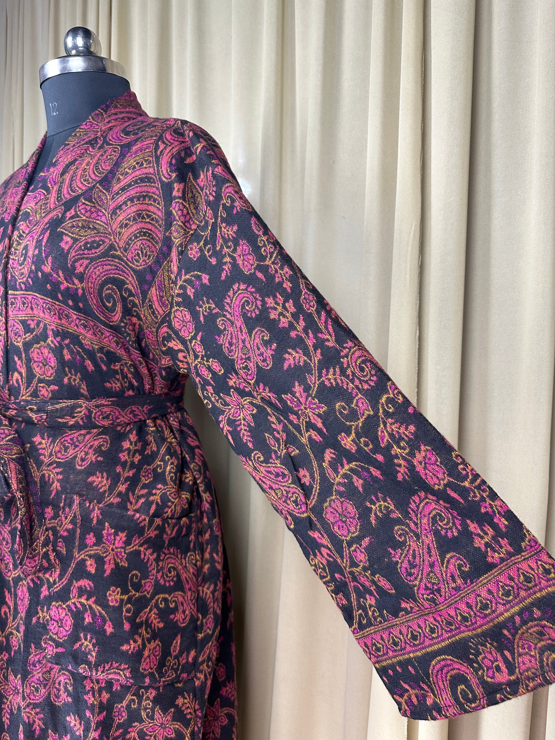 Yak Wool Blend Kimono Robe: Maroon Paisley Print, Warm Winter Wear